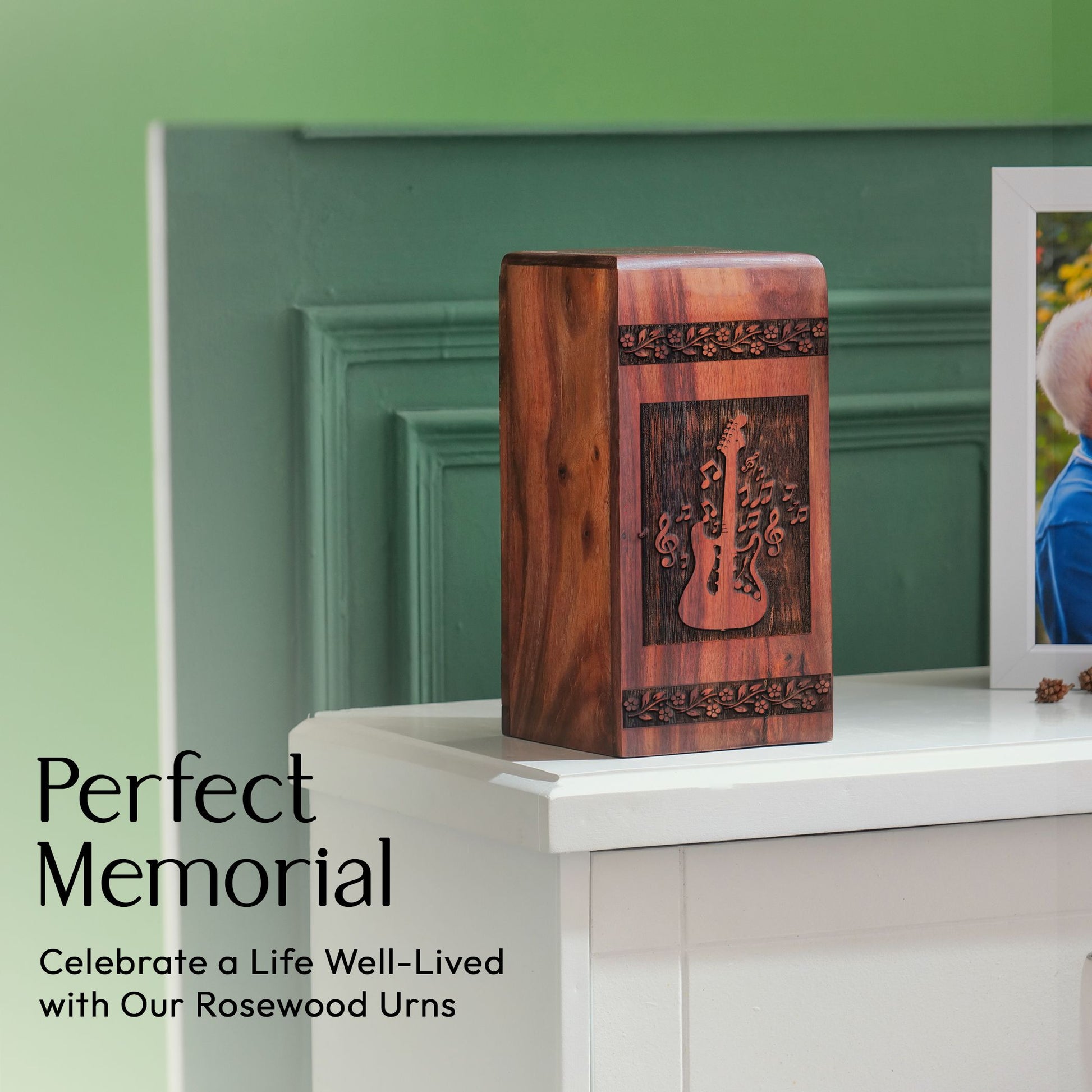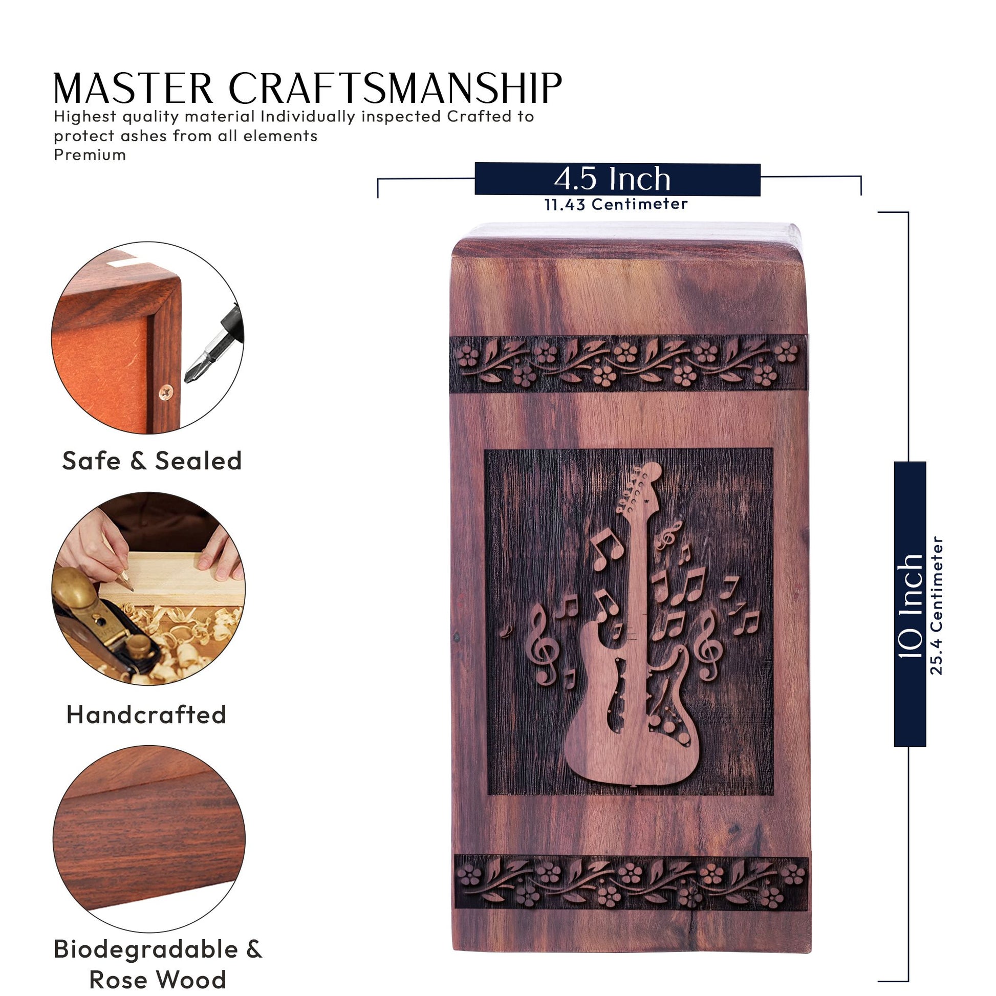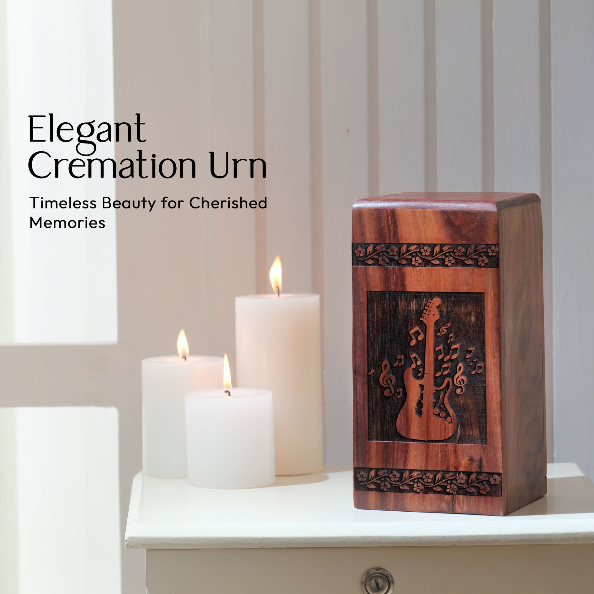 Losing a loved one is never easy, but our Wooden Cremation Urns give you a dignified and personal way to remember your treasured ones. These Large Urns, meticulously crafted from high-quality wood, offer a unique and heartfelt repository for ashes, seamlessly blending function with aesthetics. Each urn encompasses a subtle tribute, embracing a captivating guitar design which resonates with music enthusiasts and makes it ideal for individuals with an artistic inclination. This substantial remembrance piece has enough capacity to hold the cremation ashes of an adult male dad or an adult female mother. Every minute detail in our cremation urns illustrates our commitment to excellence, making them a suitable and respectful memorial for your beloved. Be it adult ashes women or men, each urn is designed to reverberate the echoes of their cherished memories. Our urns create a tangible connection to precious moments, composing an enduring legacy. A perfect memorial product for your loved one, it pays homage to their life and your mutual bond.