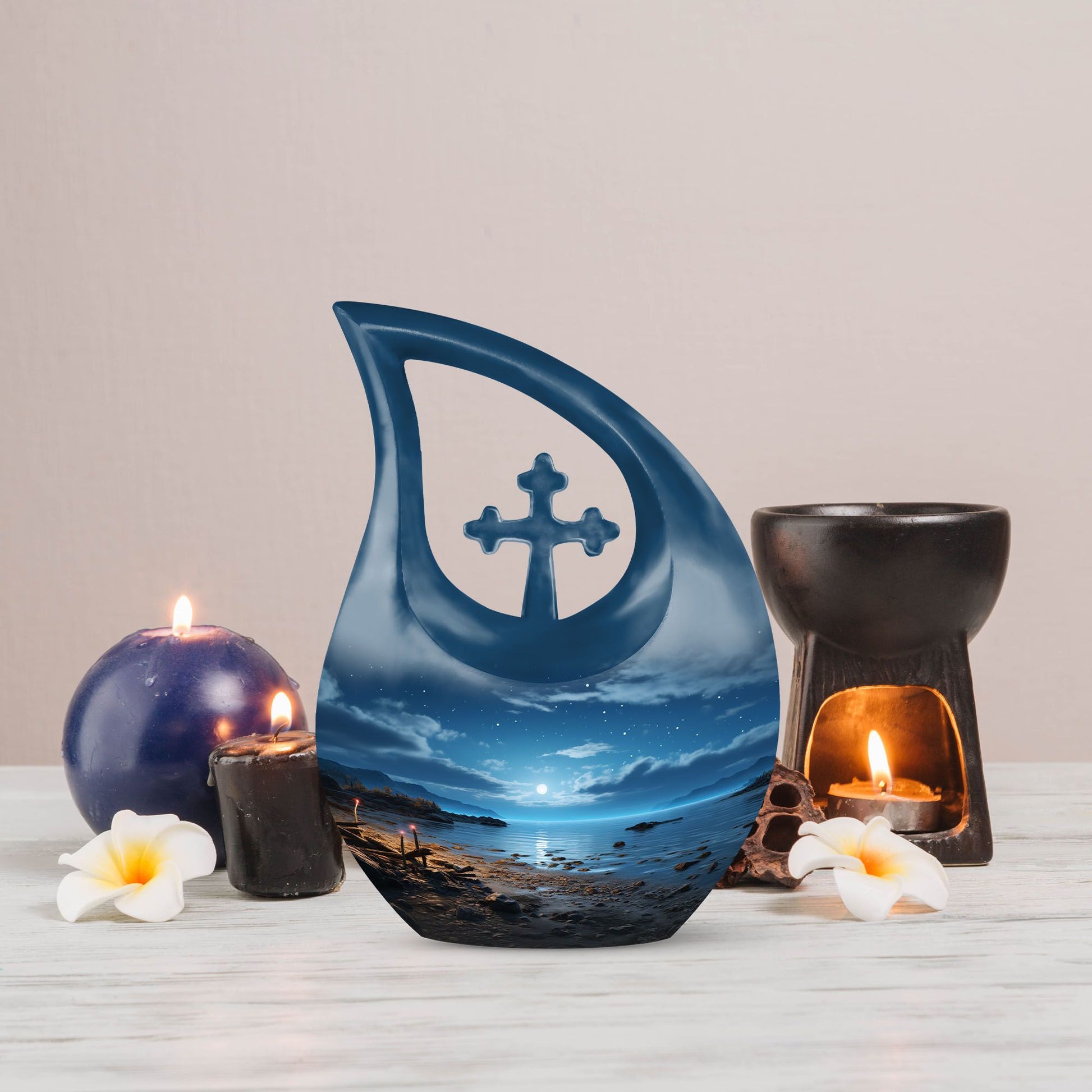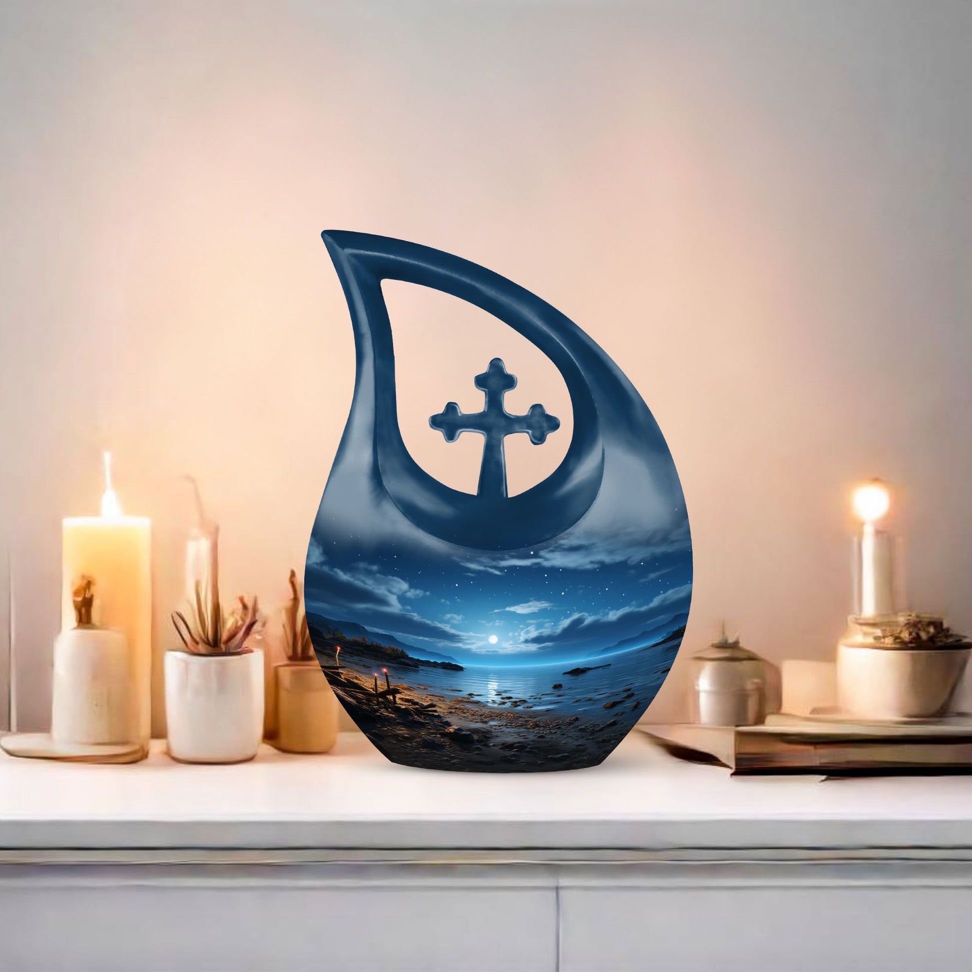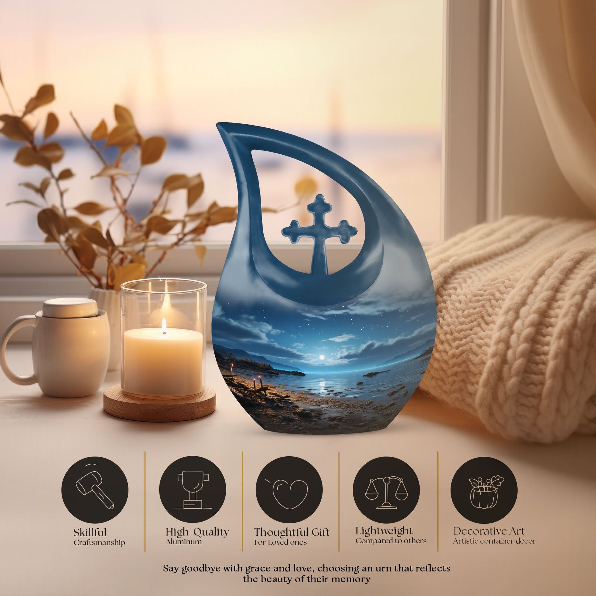 Handcrafted from premium aluminum, this women adult urn features a hand-painted night beach scene in calming shades of blue and silver. The durable finish ensures longevity, while the secure screw-top lid keeps ashes safely contained. Ideal for home memorials or burials, this urn for adult male & female offers timeless elegance suitable for both men and women. The luminous details make it one of the most beautiful urns women and families can choose for remembrance.
