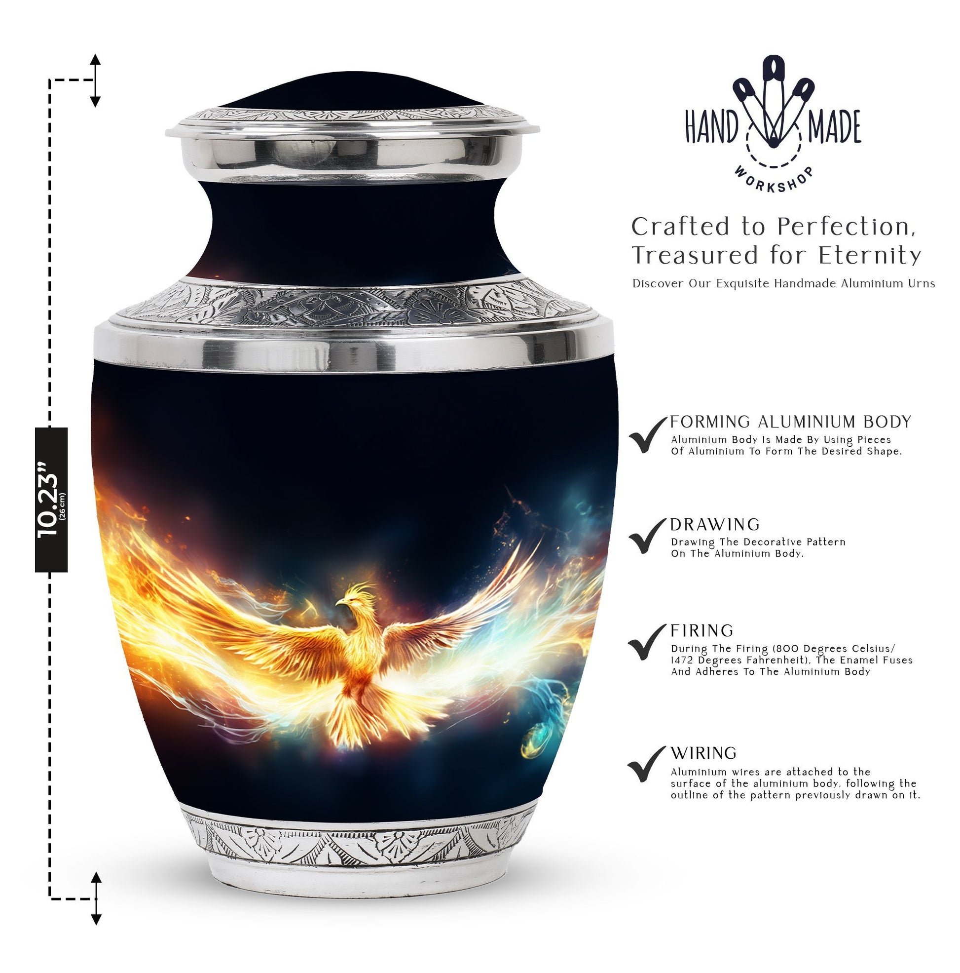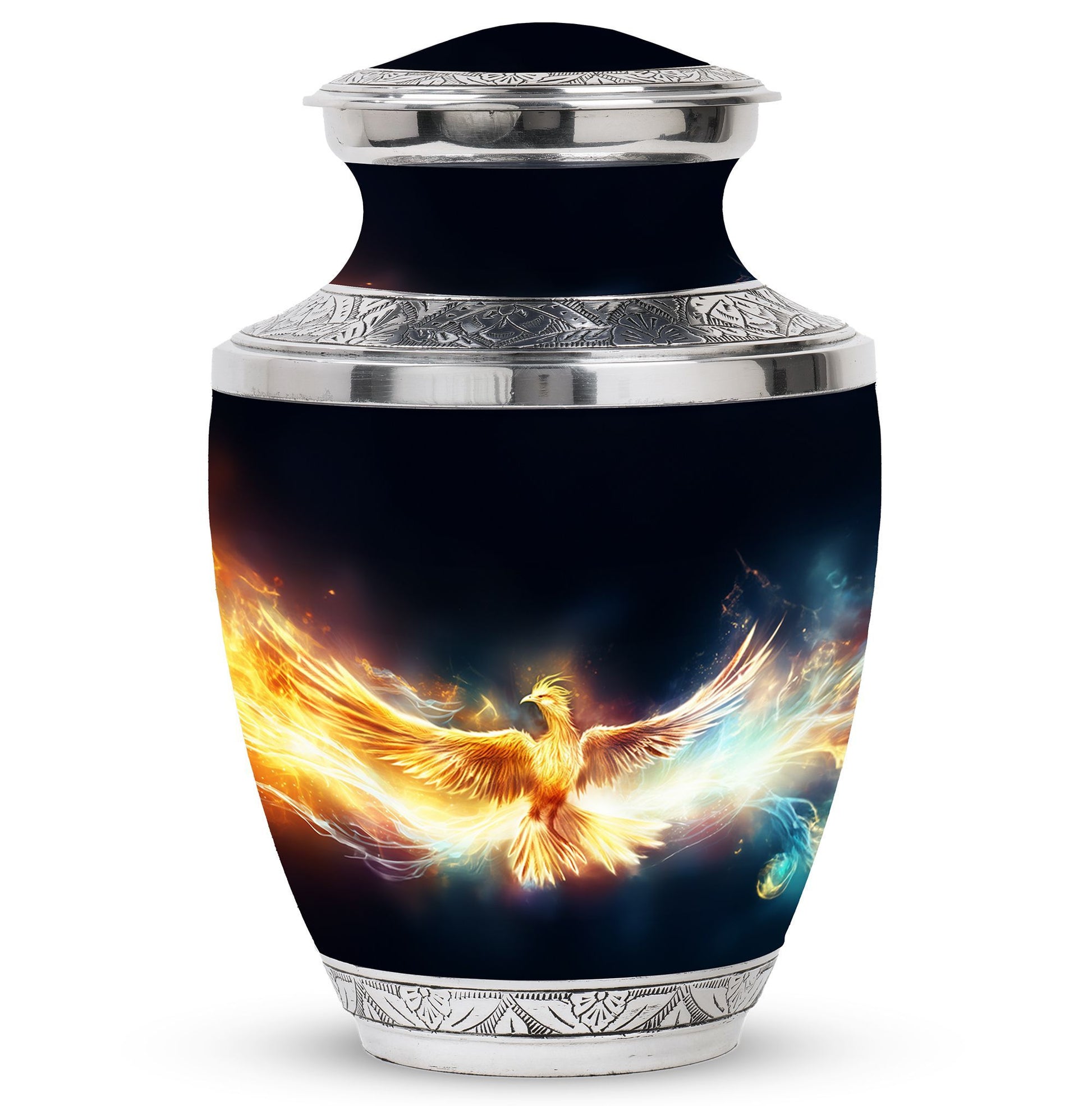 Discover peace in memory of your departed one with the Yellow Phoenix Urn. This distinct selection among unique urns for human ashes sets a serene reminder of your loved one's eternal spirit. Crafted from durable aluminium, this Large Urn offers a capacity of 200 cubic inches, ample space to respectfully contain the ashes. This 3-inch Classic Urn weighs only 3.3 pounds and stands 10 inches high, making it easy to place in your home as a compassionate reminder of one so dearly loved and missed. Its package includes a velvet pouch, providing a tasteful and dignified containment for the ashes. One can also personalize it with engraved names, making it an intimate memento of remembrance. Whether you're looking for Personalized Urns, Urns for Ashes for Dad, or decorative urns for ashes for human remains, this Yellow Phoenix Urn serves as the embodiment of timeless love and memories.