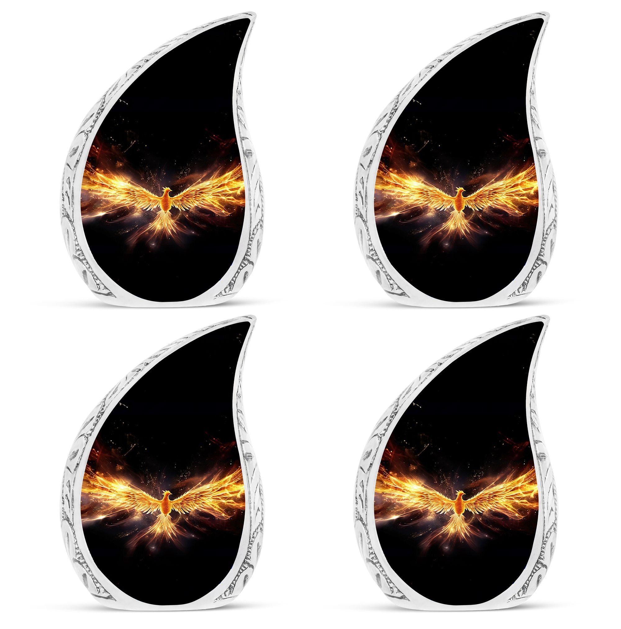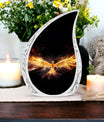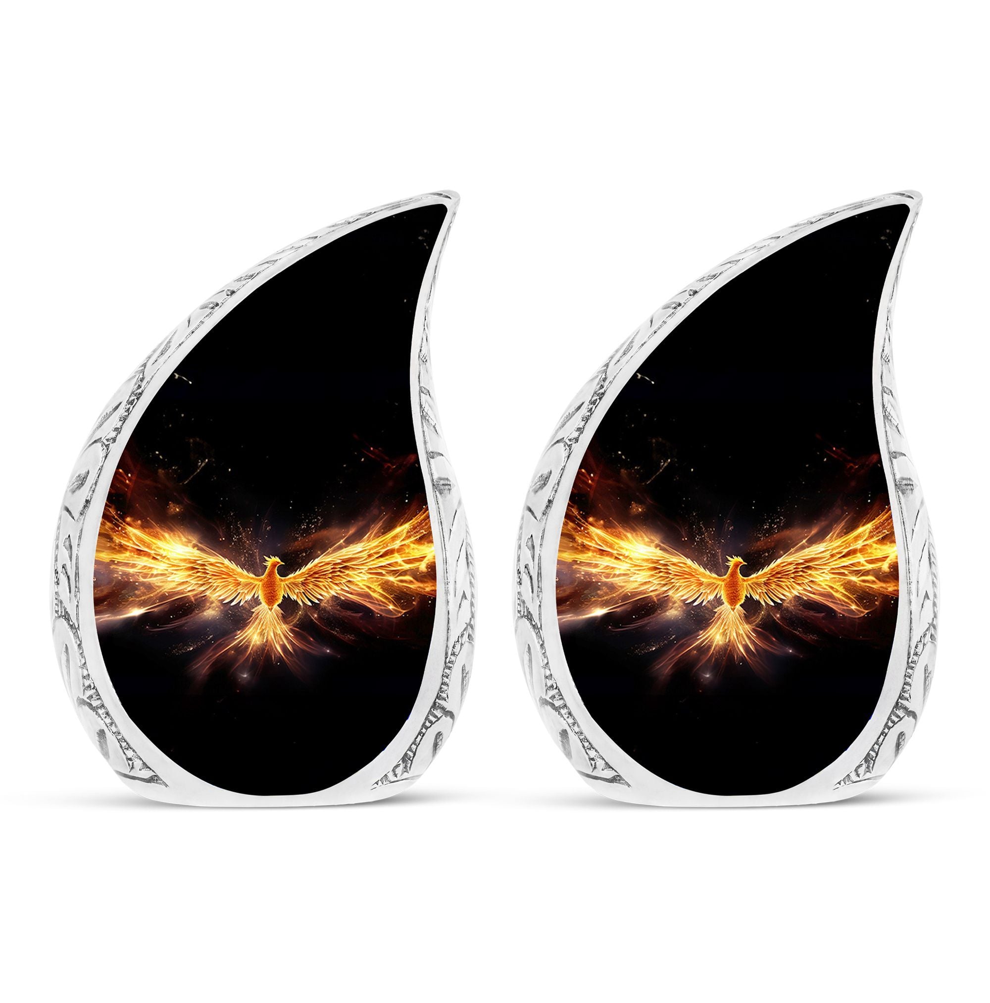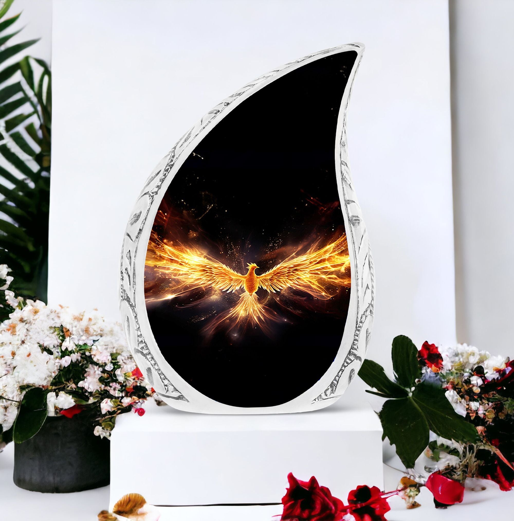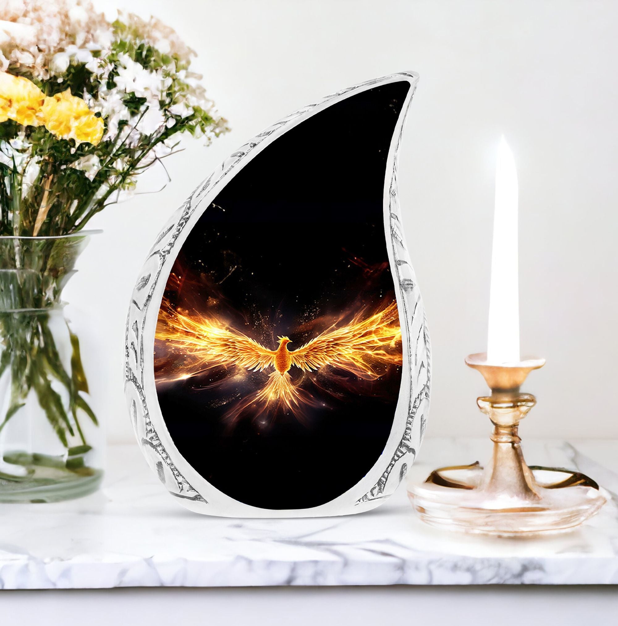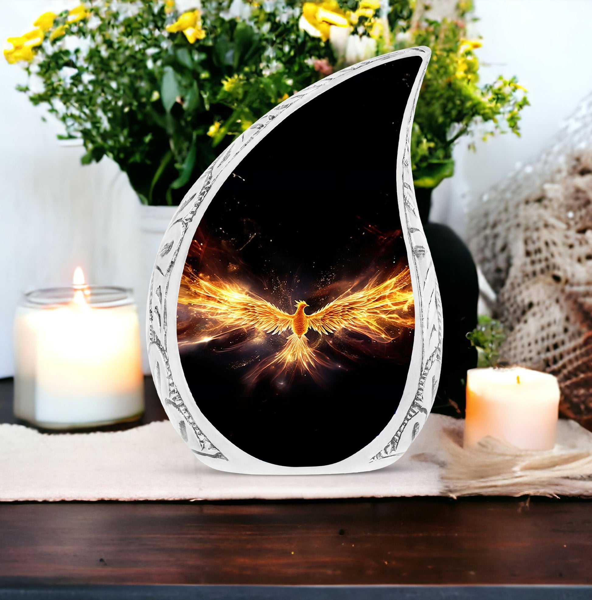 Cherish and honor the memory of your dearly departed ones with our Yellow Phoenix Urn. This tastefully designed large-sized urn, with dimensions of 10 inches in height, is made to hold approximately 200 cubic inches of human cremation ashes. It's made from quality aluminium, weighing 3.3 pounds, reflecting the strength and durability we wish to offer during such challenging times. Our urn is a tasteful statement of remembrance, without resorting to words. Each order comes with a velvet pouch for dignified containment of the ashes. To add a personal touch, you may have your loved one's name engraved, making this a truly personalized urn. Emphasizing 'Sorry for your loss,’ we ensure the remembrance remains on your terms. This hard-wearing, modern urn for ashes provides a respectful final resting place, and it's a suitable choice for those seeking metal urns for ashes. The classic design further adds poise to this timeless keepsake.