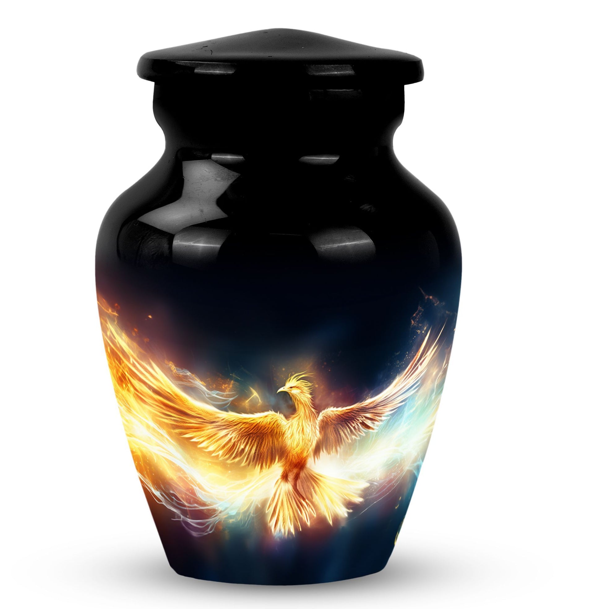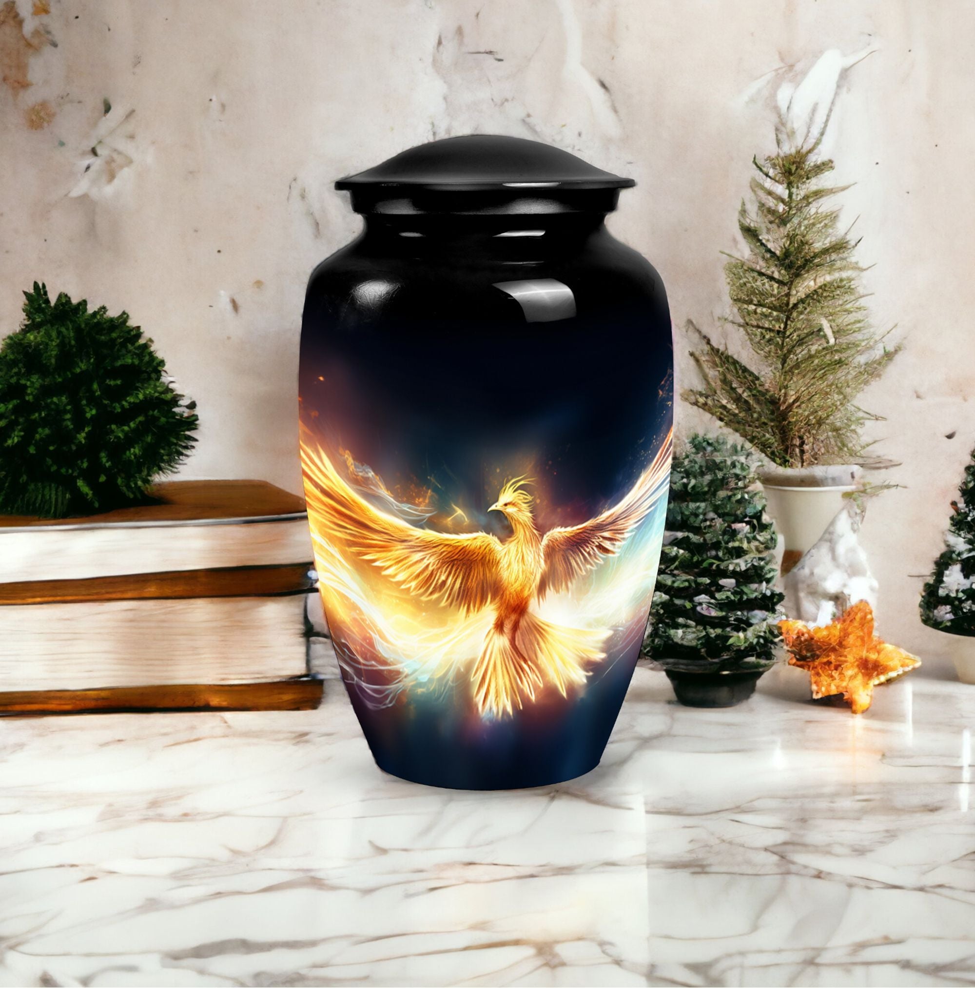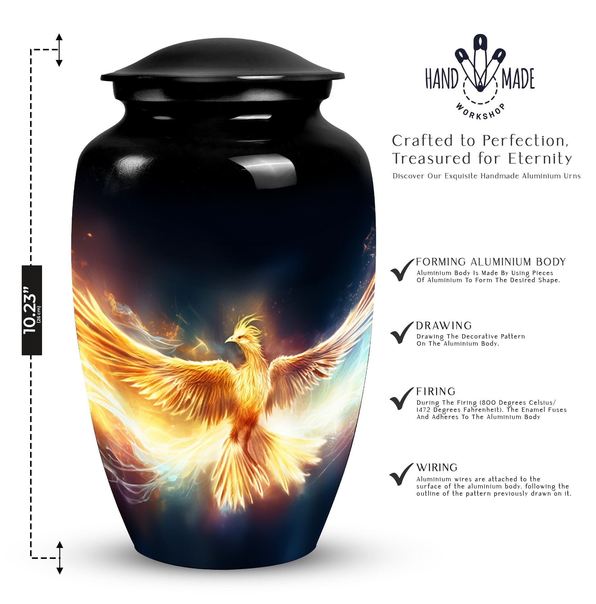 Honor the memory of your departed loved ones with our 'Yellow Phoenix Urn,' a unique, thoughtful addition to our collection of large urns for human remains. With its generous 200 cubic inches capacity, this 3.3 pounds hand-crafted aluminum urn beautifully represents an enduring legacy. Its dimensions stand tall at 10 inches in height, portraying a classic urn silhouette that seamlessly blends into your home decor. Your ordered urn comes with a velvet pouch, safeguarding the precious contents within. Make it truly unique with our customization option - you can personalize it by engraving names. So, whether you need it for Dad or someone else cherished, this urn serves as a fitting tribute. Note: This urn is a stunning 3 inch offering in our memorial urn series and a statement piece among personalized urns and decorative urns for ashes. It provides a timeless way of paying tribute while acting as the perfect memorial for your loved one.