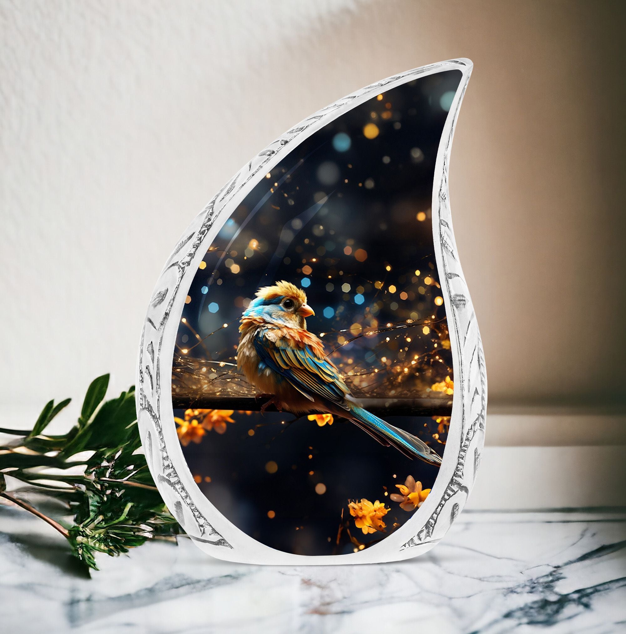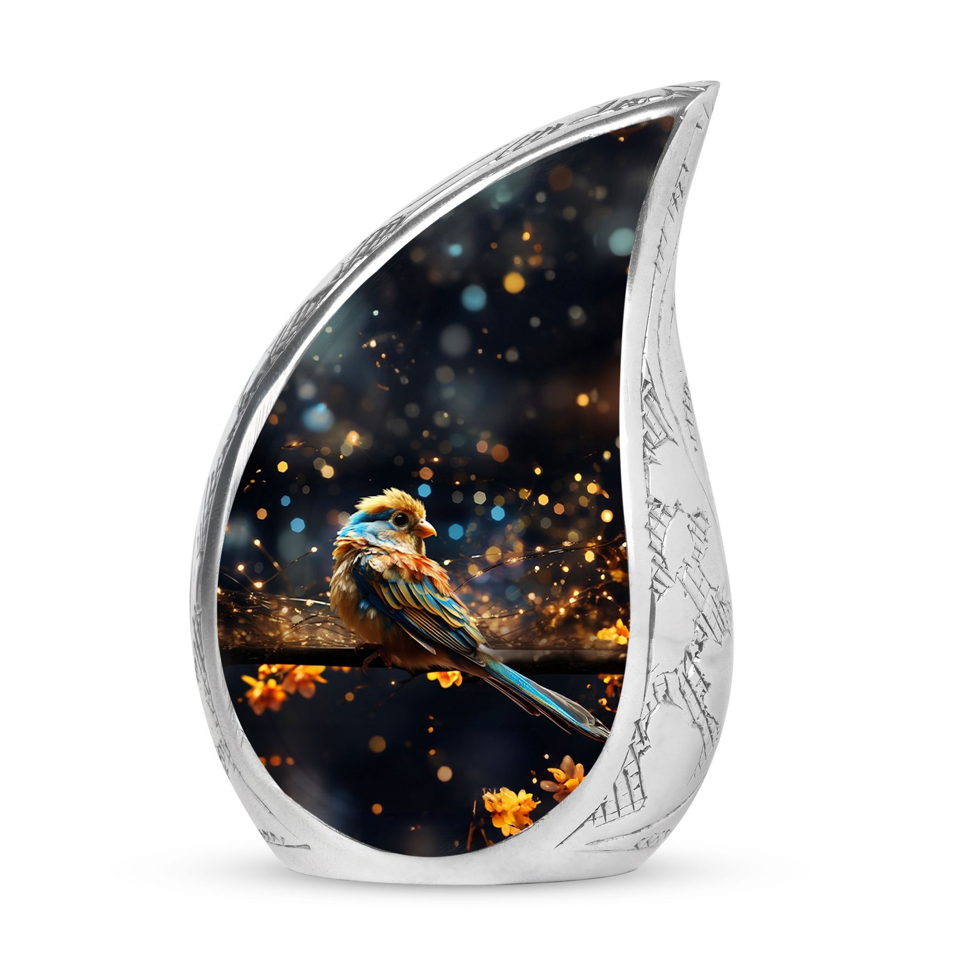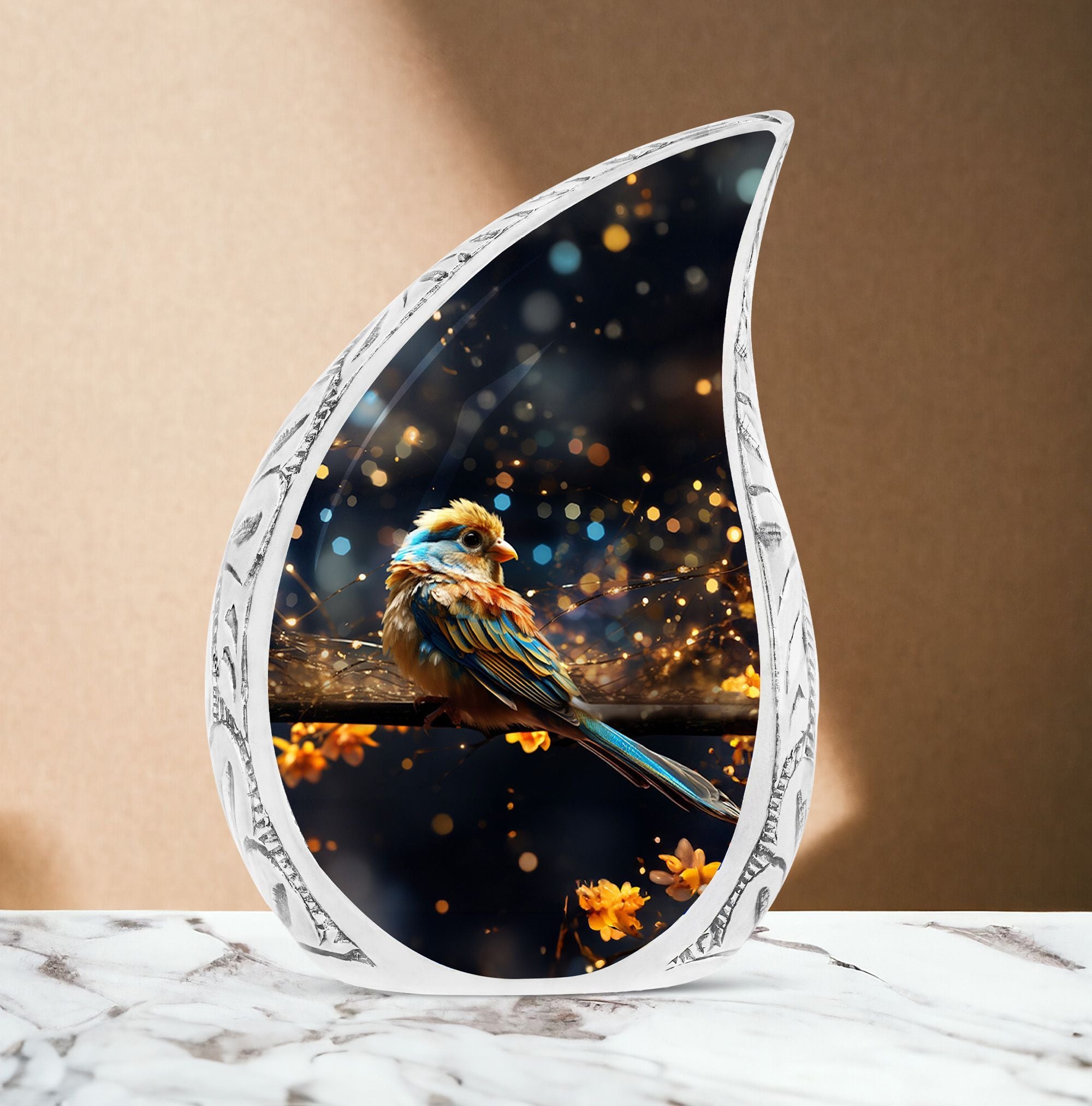 Cherish the memory of your loved one with the Yellow Sparrow urn, a flawless masterpiece from our range of memorial urns. Standing at 10 inches in height, this decorative urn is both sizeable and substantial, with a weight of 3.3 pounds. It's meticulously crafted from high-quality aluminium that assures longevity, offering an enduring tribute for decades to come. The urn's 200 cubic inch capacity ensures comprehensive containment for human ashes, making this particular design perfect for large urns for human ashes. This product elevates the personalization aspect as you have the option to customize it with engraved names, adding a caring touch to an already heartwarming tribute. Along with the urn, we provide a plush velvet pouch, acting as an additional haven for the ashes. Keep the essence of your beloved alive with this large urn, an encompassing choice for human cremation urns or decorative urns.