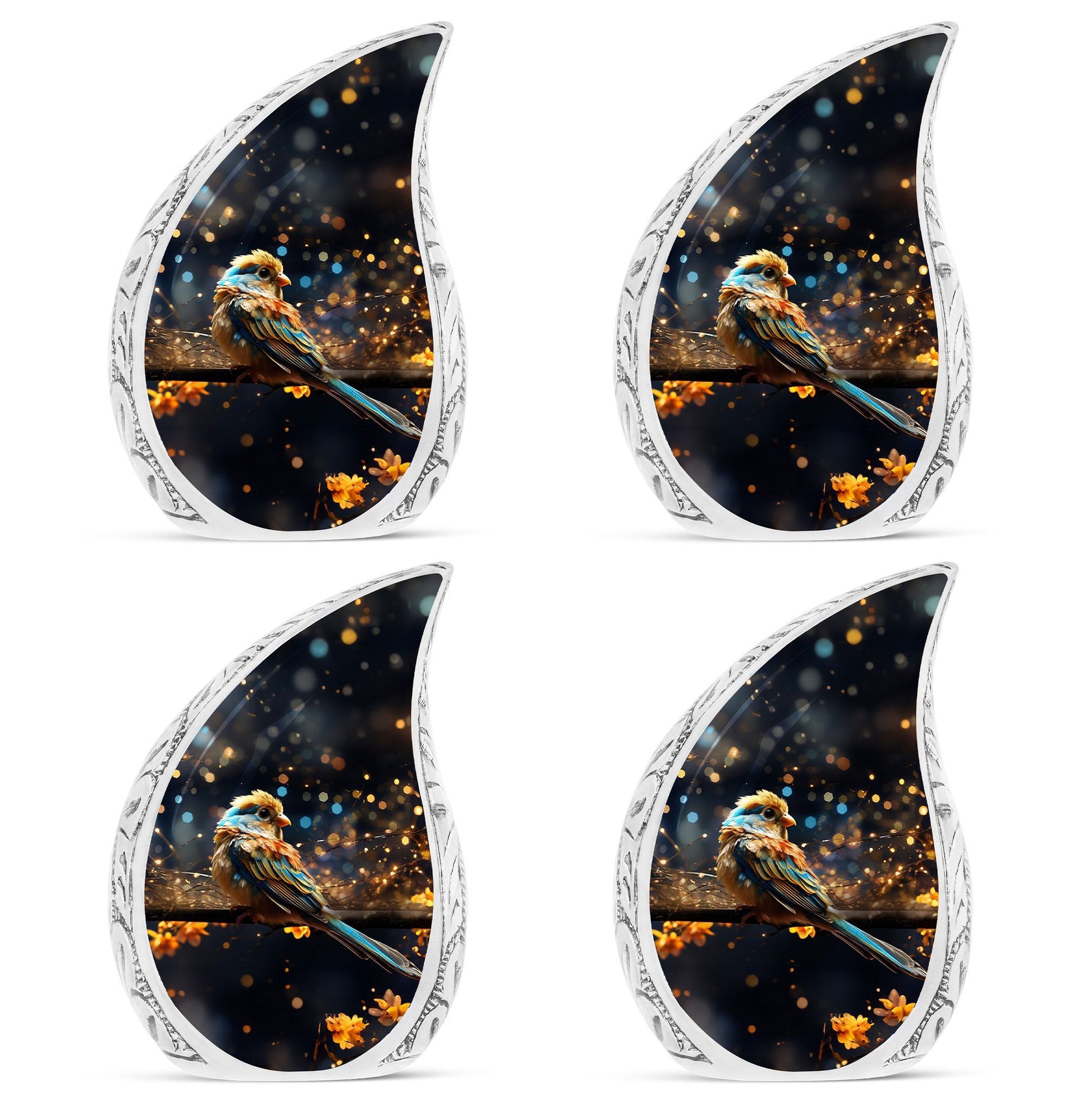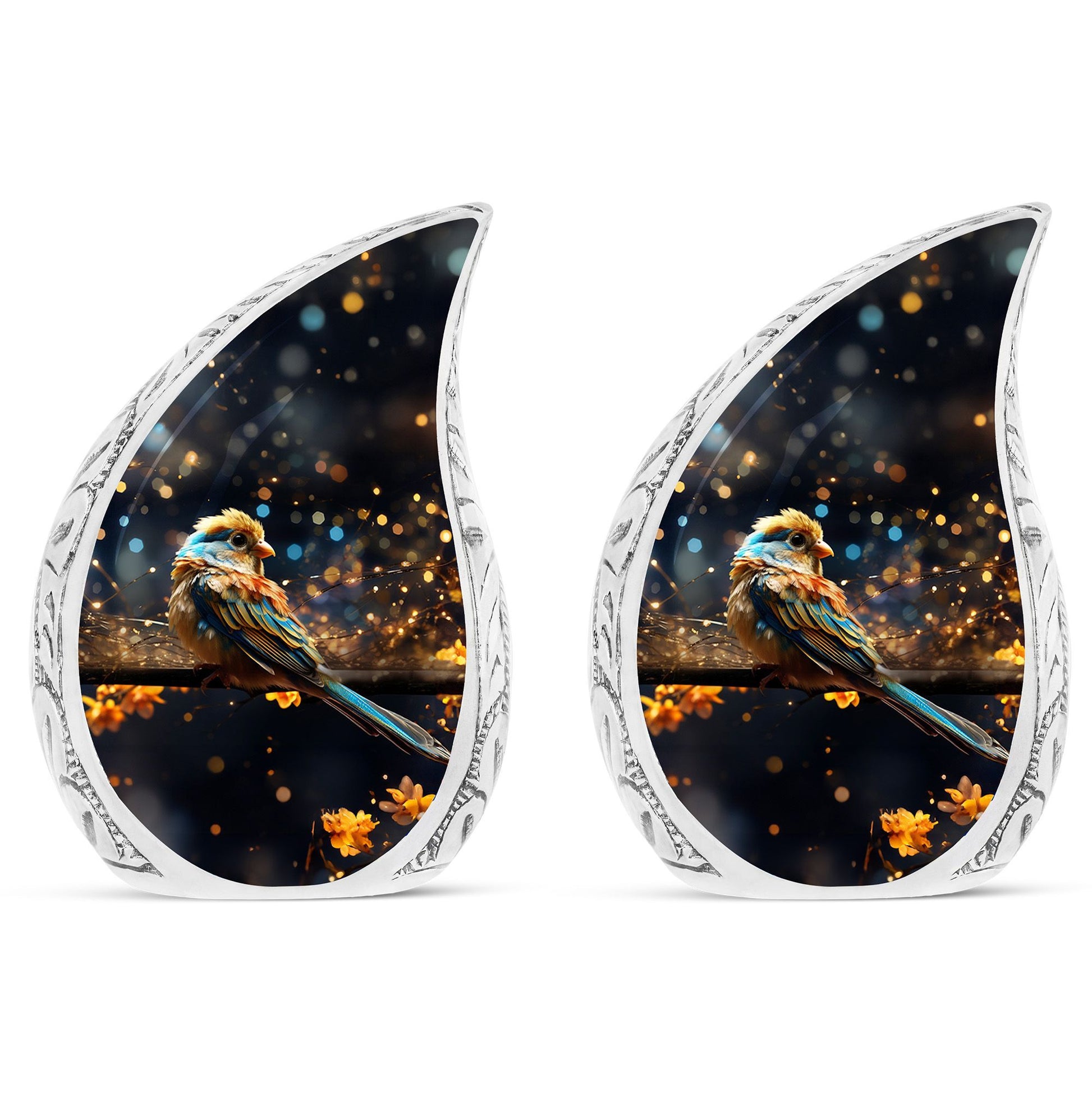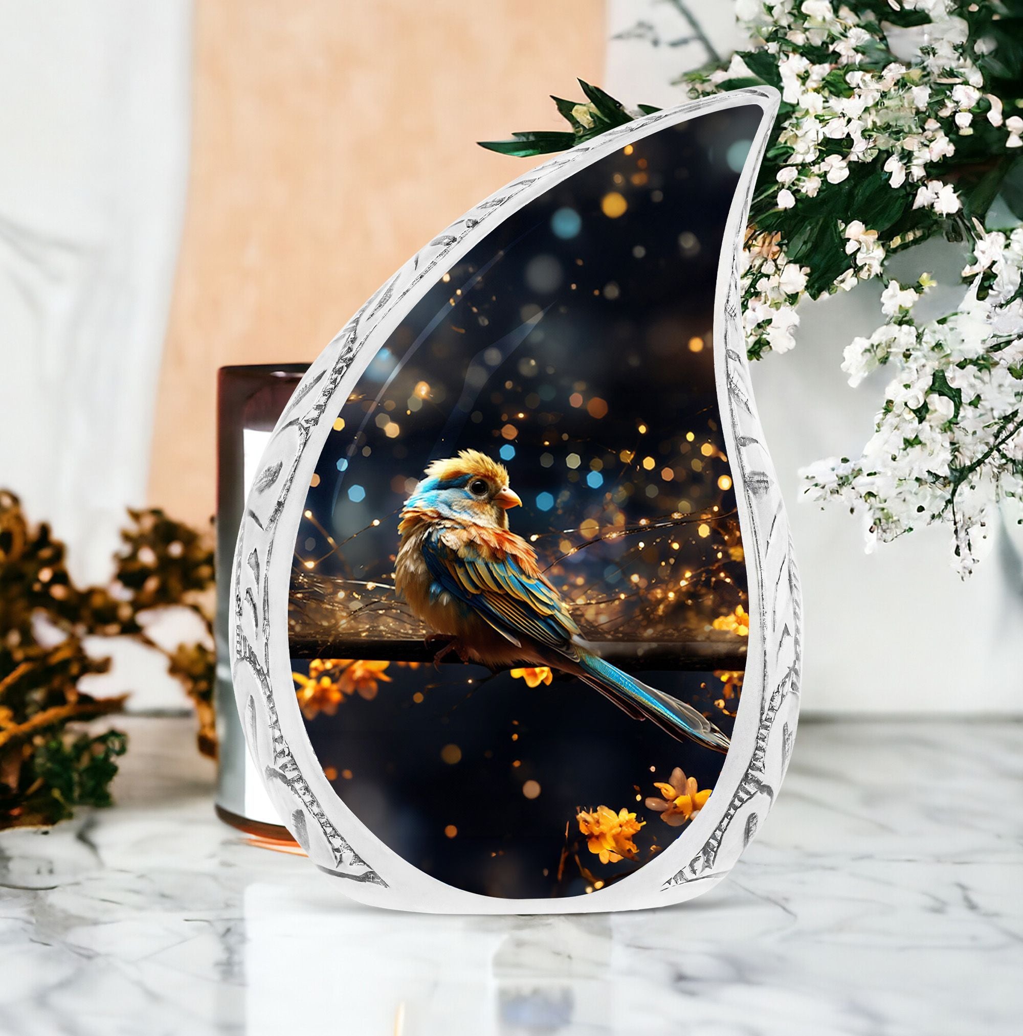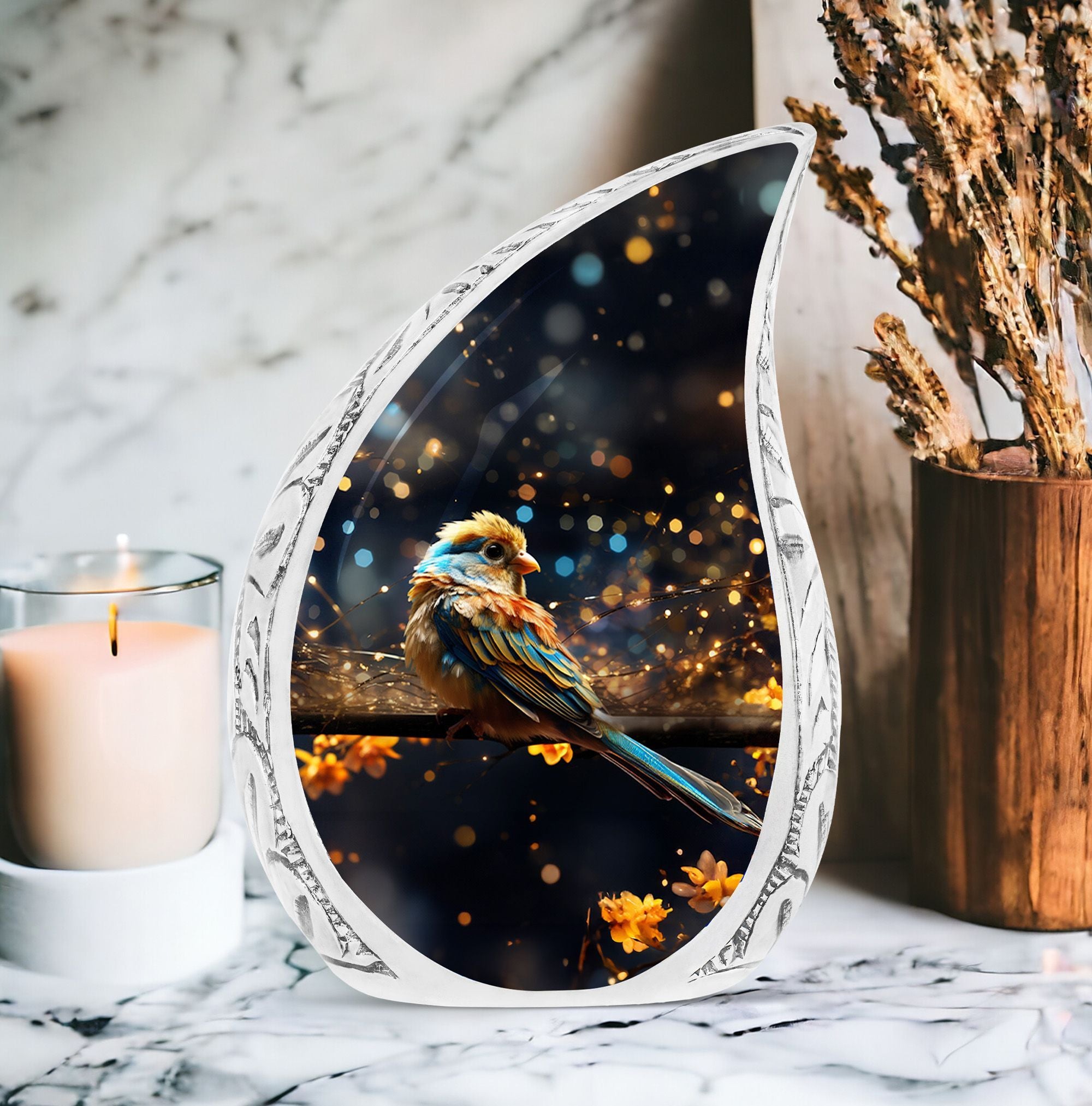 Cherish the memory of your loved one with the Yellow Sparrow urn, a flawless masterpiece from our range of memorial urns. Standing at 10 inches in height, this decorative urn is both sizeable and substantial, with a weight of 3.3 pounds. It's meticulously crafted from high-quality aluminium that assures longevity, offering an enduring tribute for decades to come. The urn's 200 cubic inch capacity ensures comprehensive containment for human ashes, making this particular design perfect for large urns for human ashes. This product elevates the personalization aspect as you have the option to customize it with engraved names, adding a caring touch to an already heartwarming tribute. Along with the urn, we provide a plush velvet pouch, acting as an additional haven for the ashes. Keep the essence of your beloved alive with this large urn, an encompassing choice for human cremation urns or decorative urns.