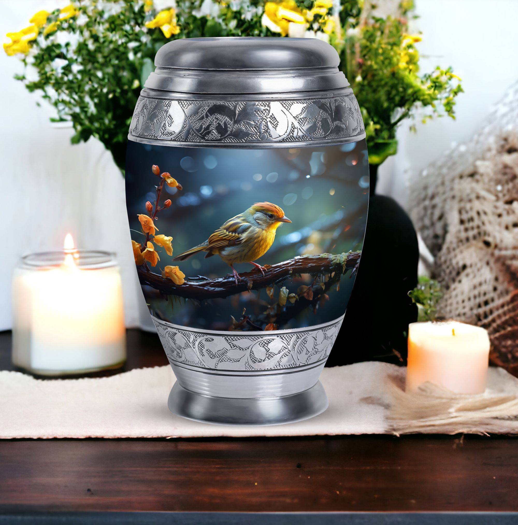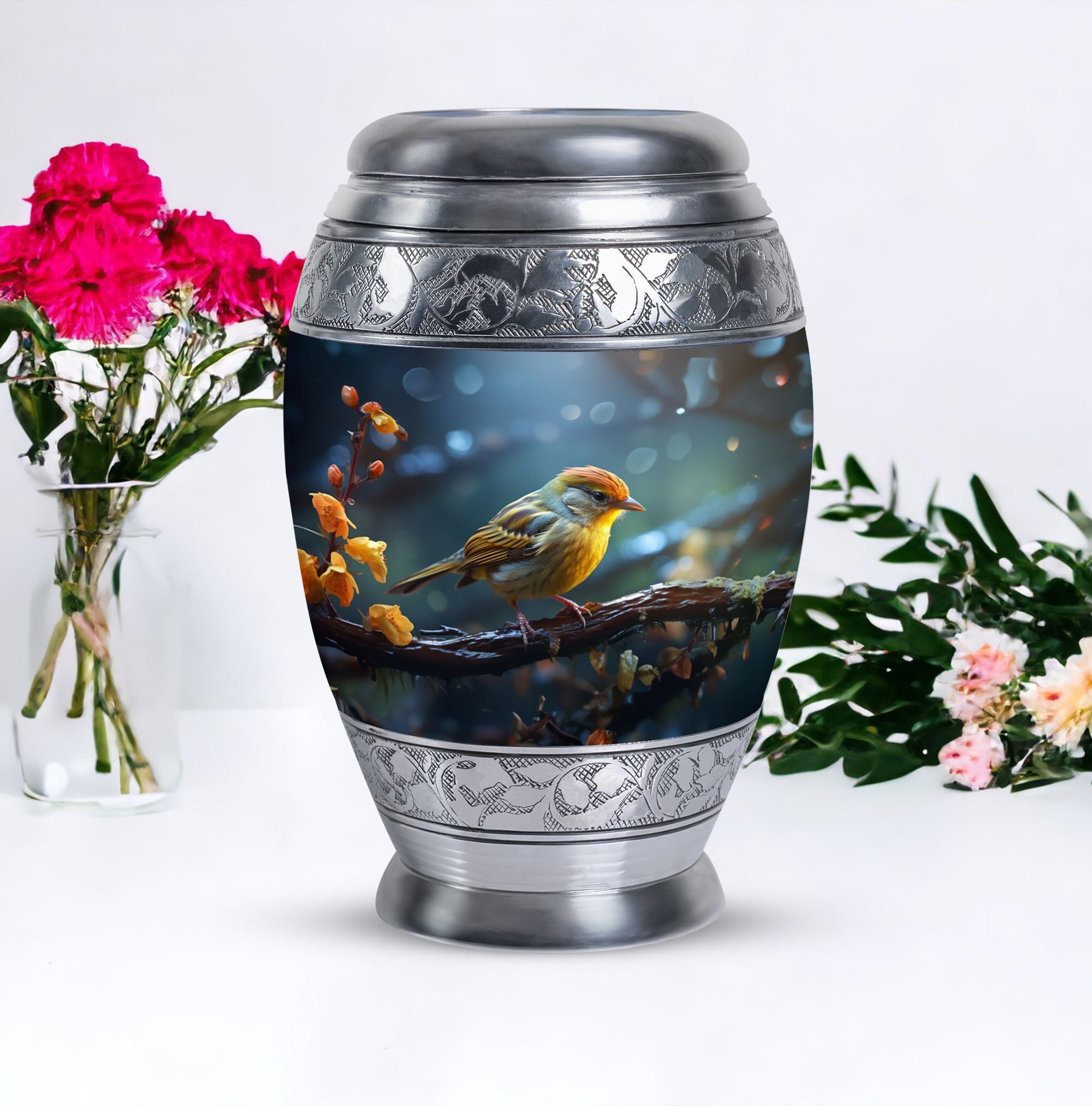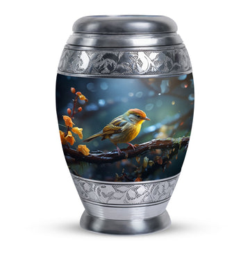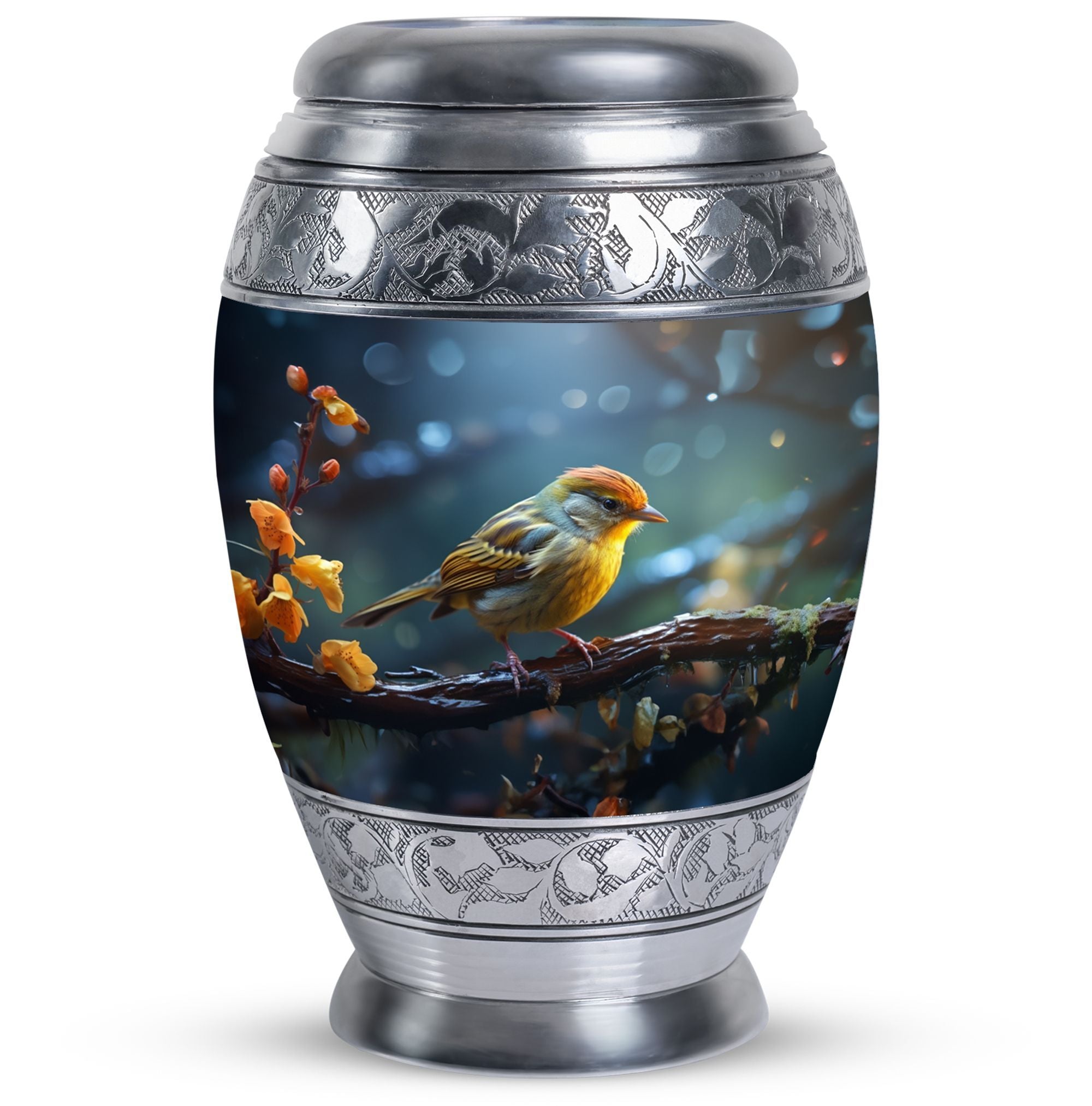 Create an everlasting memory of your beloved with the classic Yellow Sparrow Cremation Urn, specially designed for ashes. This 3-inch large urn is constructed with excellent quality aluminium, striking a balance between durability and elegance. It weighs around 3.3 pounds with a capacity of 200 cubic inches, making it a perfect memorial urn for the ashes of adults. The urn's dimensions are 10 inches in height, making it an unobtrusive yet meaningful addition to your home. The thoughtful customization feature allows you to engrave names, making it a unique and heartfelt tribute. The product comes with a velvet pouch, providing a secure and dignified containment for the ashes of your cherished one. This metal urn with its unique appeal subtly speaks of your unending love and remembrance. Consider this cremation container for those in quest of large urns for ashes, unique urns for dad, or metal urns for ashes. Keep your beloved's memories alive, in grace, dignity, and serenity.