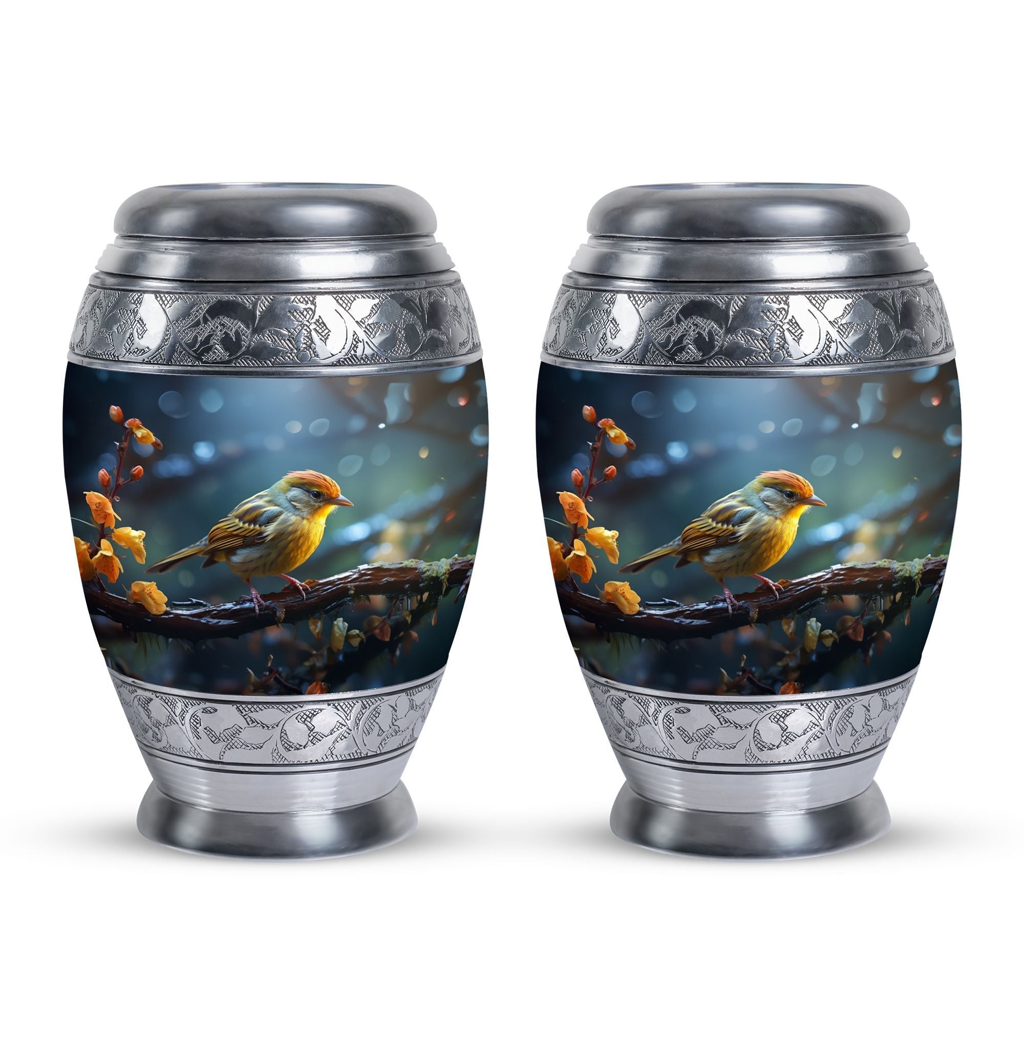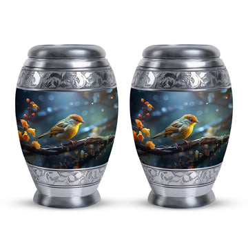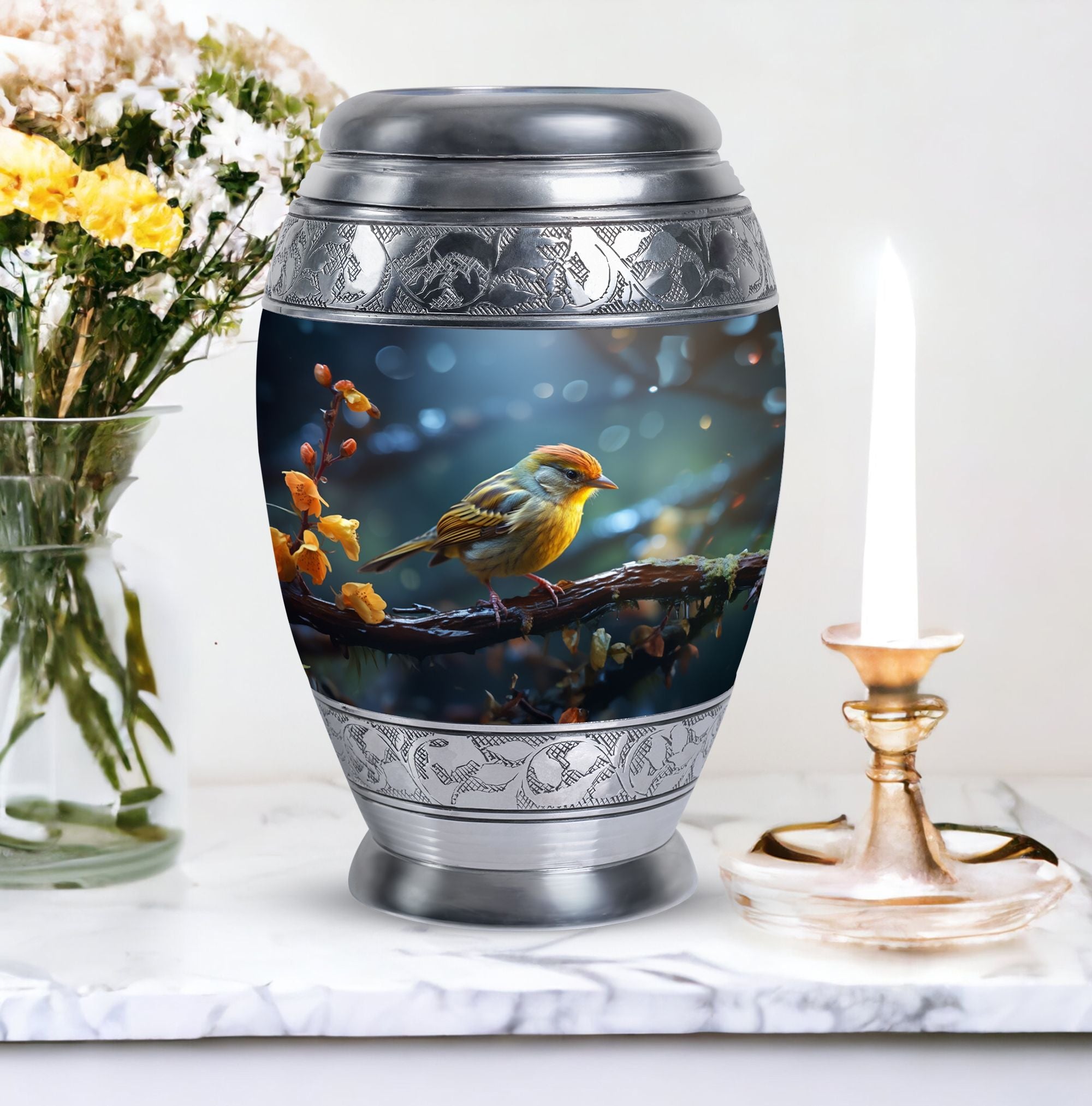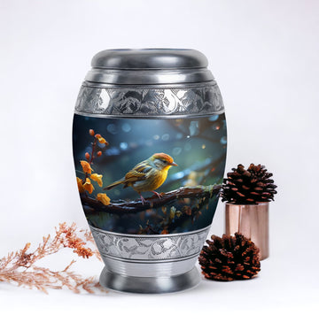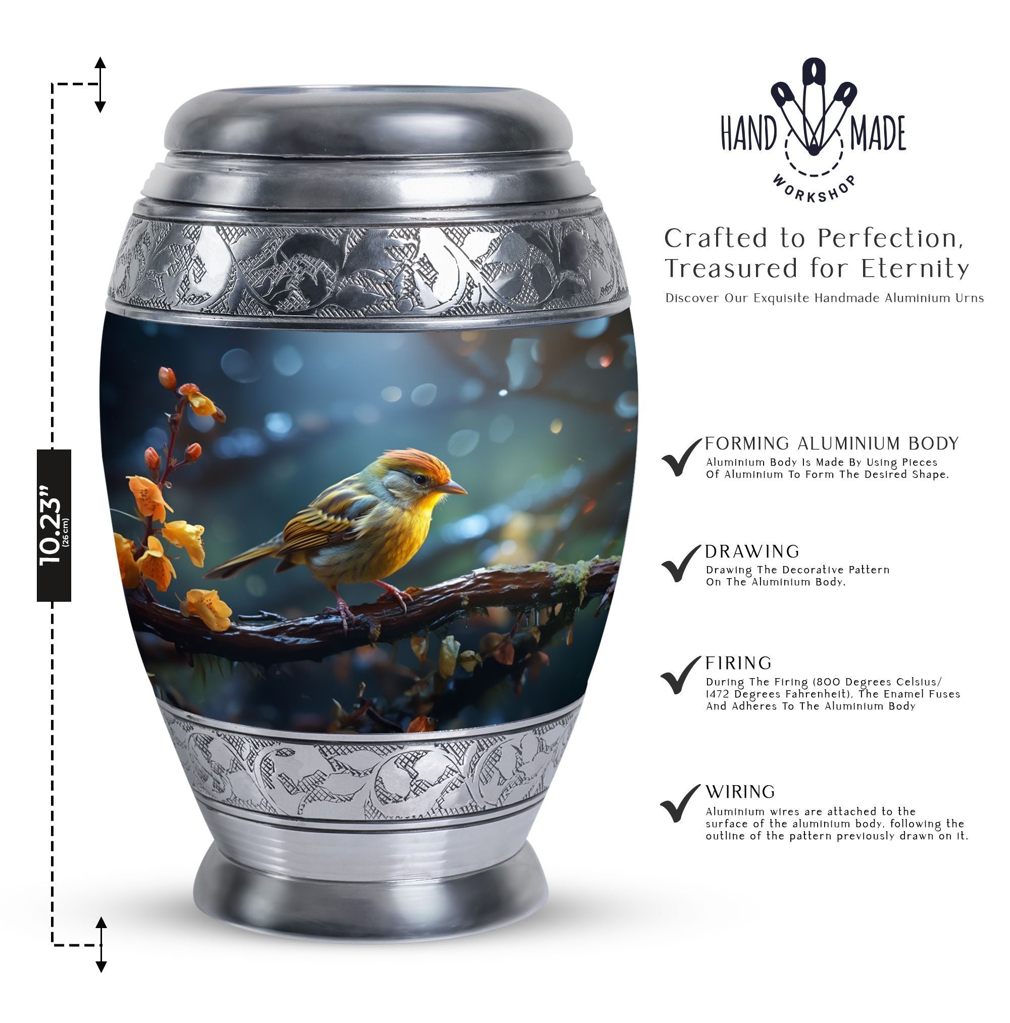 Create an everlasting memory of your beloved with the classic Yellow Sparrow Cremation Urn, specially designed for ashes. This 3-inch large urn is constructed with excellent quality aluminium, striking a balance between durability and elegance. It weighs around 3.3 pounds with a capacity of 200 cubic inches, making it a perfect memorial urn for the ashes of adults. The urn's dimensions are 10 inches in height, making it an unobtrusive yet meaningful addition to your home. The thoughtful customization feature allows you to engrave names, making it a unique and heartfelt tribute. The product comes with a velvet pouch, providing a secure and dignified containment for the ashes of your cherished one. This metal urn with its unique appeal subtly speaks of your unending love and remembrance. Consider this cremation container for those in quest of large urns for ashes, unique urns for dad, or metal urns for ashes. Keep your beloved's memories alive, in grace, dignity, and serenity.