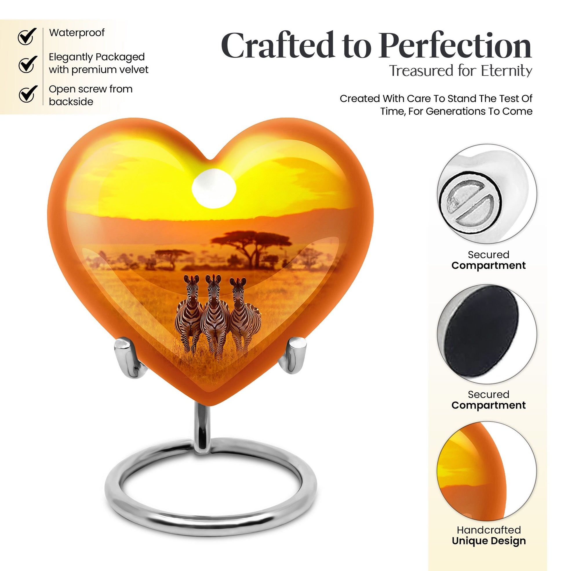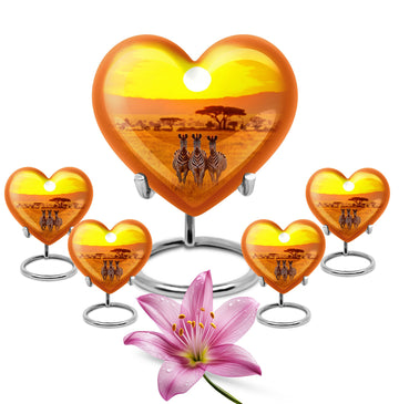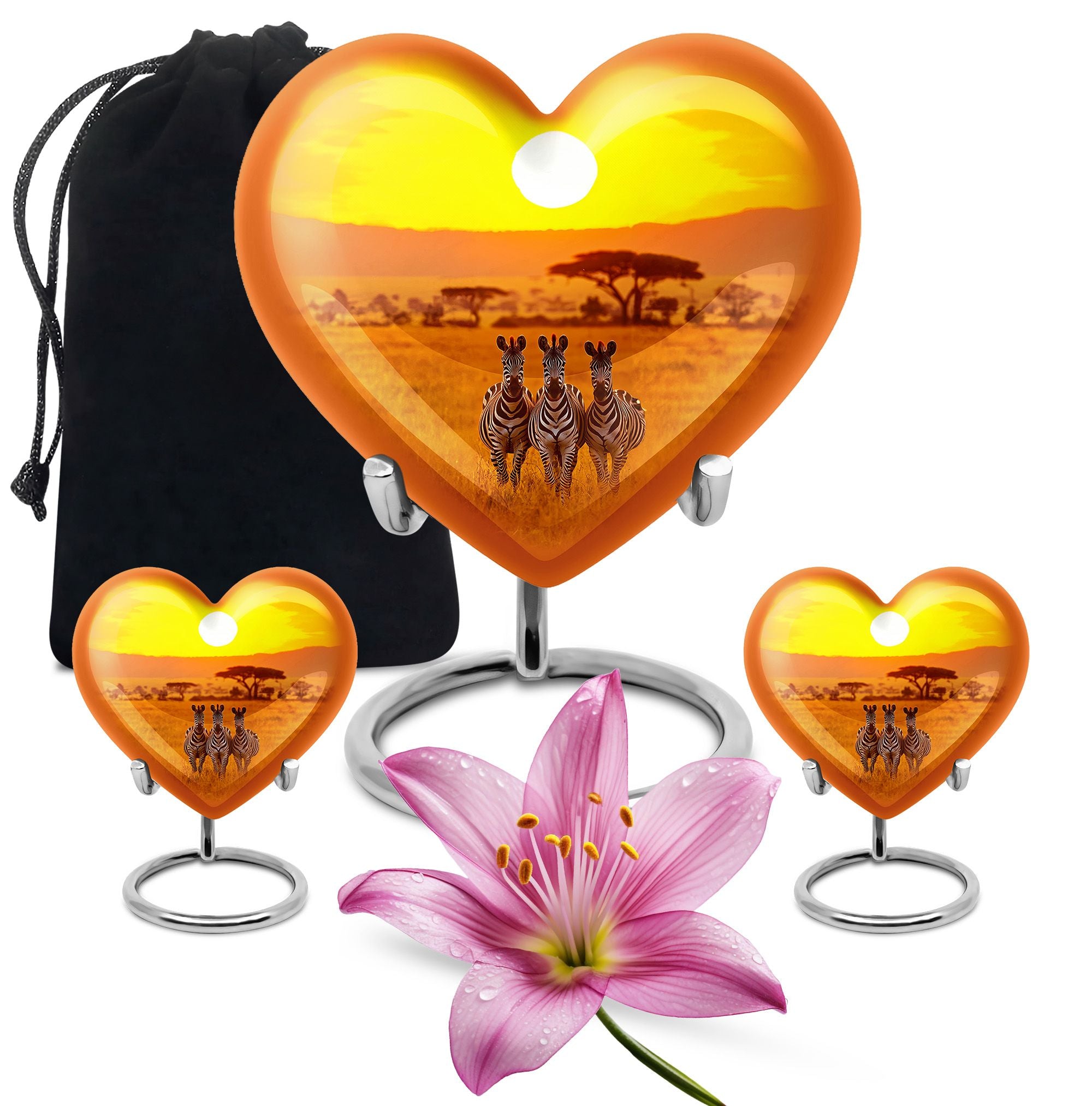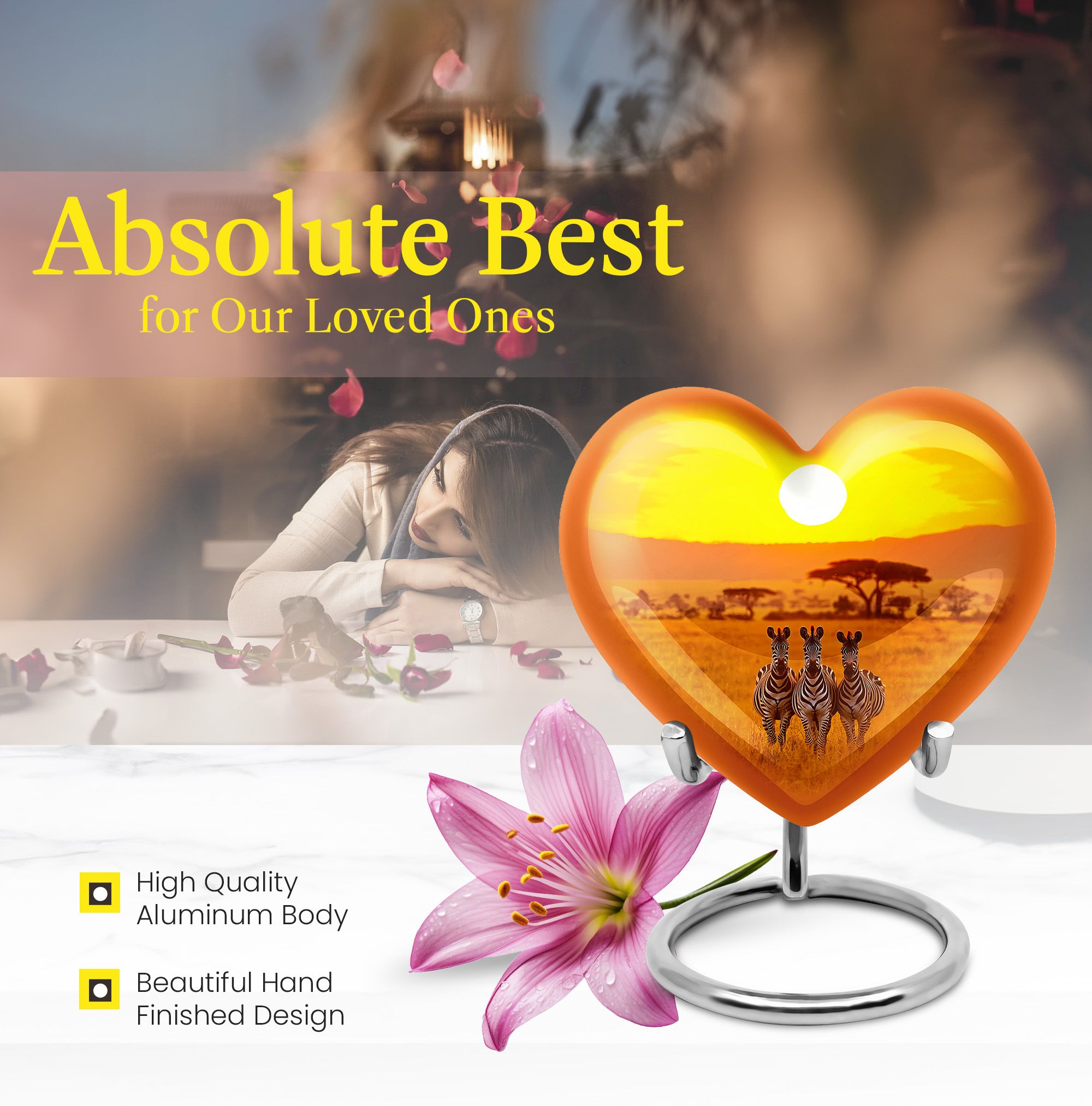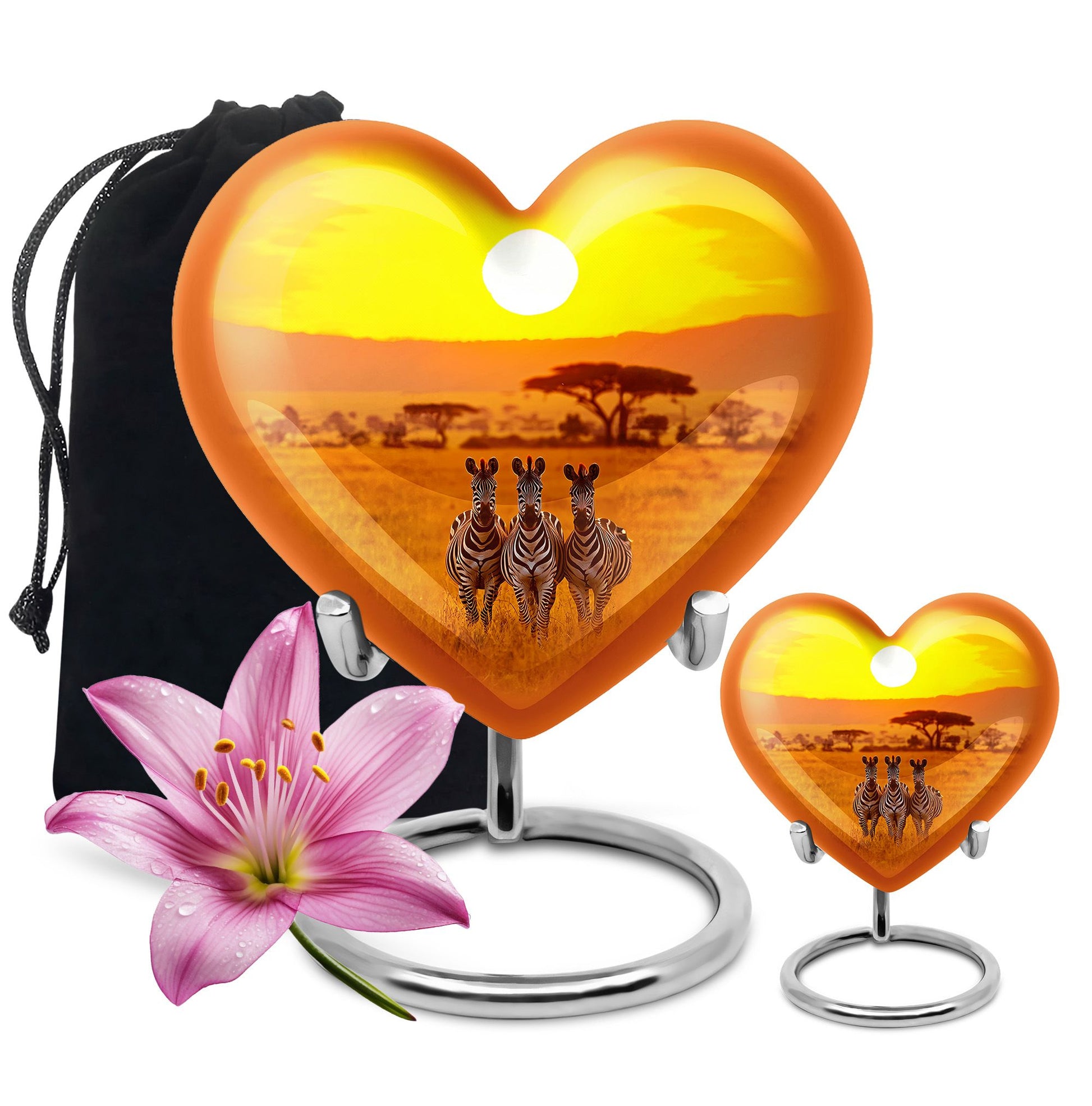 An enchanting tribute to your departed loved one, this 'Zebra Urn' is a unique choice among funeral decorative urns. Balancing poignancy and elegance, this 10-inch urn brings an abstract theme overlayed onto an aluminium body, creating a visually engaging memorial urn that reflects the boundless love shared. A lightweight piece, it weighs in at a mere 3.3 pounds yet can encapsulate up to 200 cubic inches of a cherished individual's ashes. This uniquely large urn is enveloped in a velvet pouch, assuring utmost respect and dignity in containment. Enhancing its distinction, personalize it with the engraved names of those held dear. Let this urn human adult male or urns for cremation ashes mother encapsulates the essence of your adoration in its majestically sculpted form. An abstract tribute that respects the life lived and love shared, the zebra urn serves as a beacon of fond memories and undying affection.