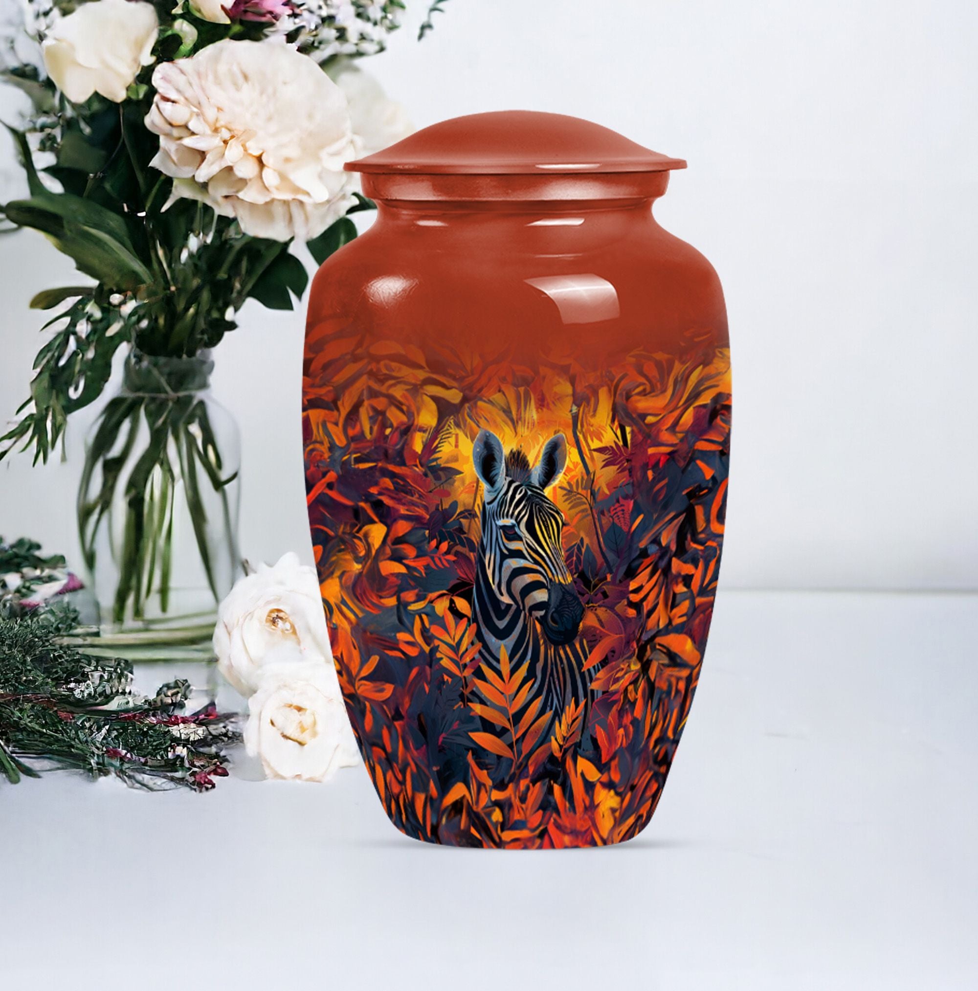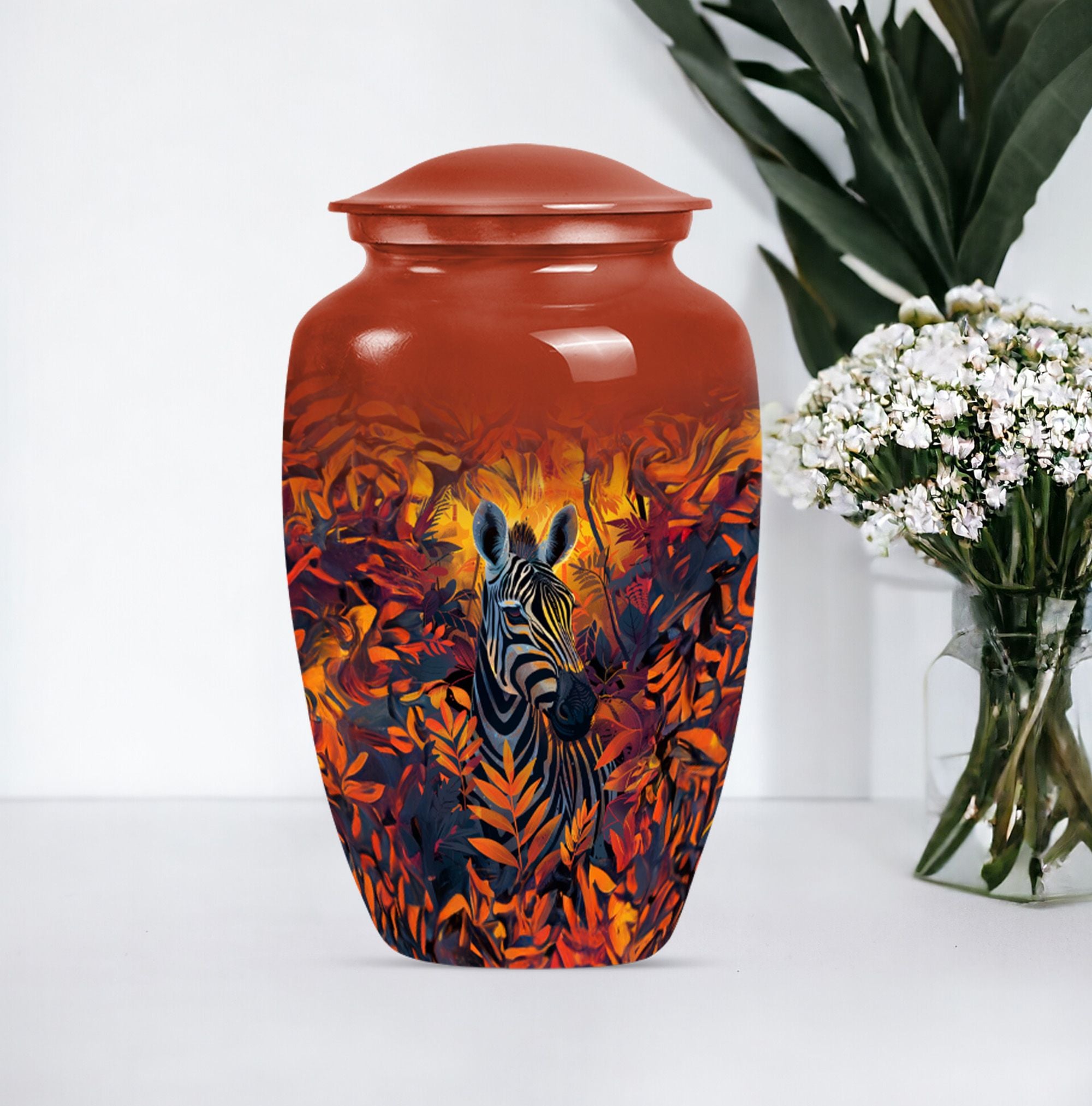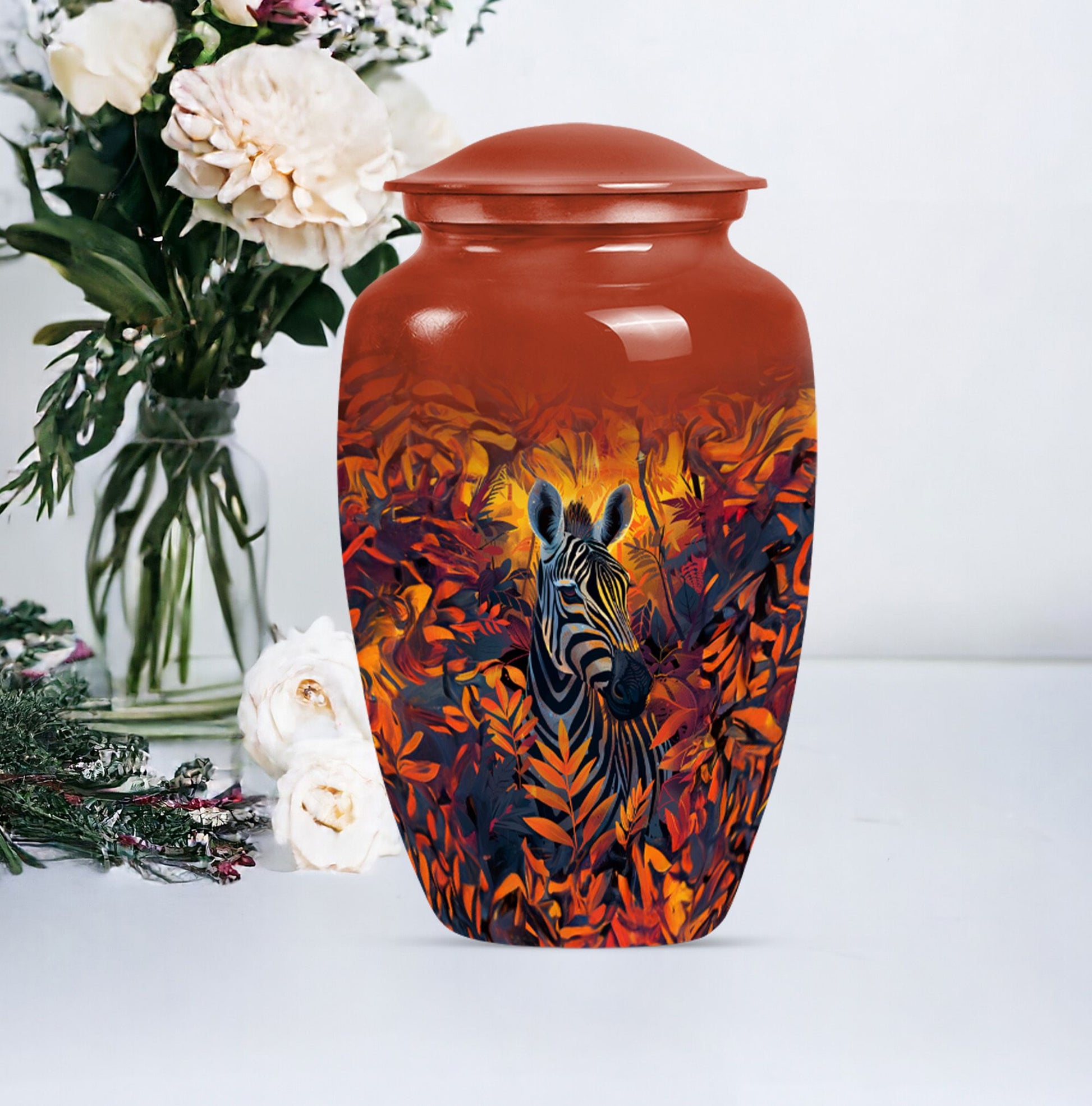Embark on a journey of remembrance with our brilliant zebra urn. This large, classic urn is perfect for storing 200 cubic inches of loved one's ashes securely. The urn towers at an impressive height of 10-inch, casting a serene sense of presence in any setting. Each product comes with a plush velvet pouch, providing a delicate and respectful containment for the cherished remains. We understand the need for individuality during this sensitive time, which is why we are offering a unique personalization feature- impart your touch to this memorial with engraved names. Crafted with high quality aluminium, the urn not only stands the test of time but also adds a touch of elegance to its surroundings. The abstract theme of the design serves to ignite remembrance and peace, going beyond functionality. Our product seamlessly balances weight and size, weighing a mere 3.3 pounds, making it easy to handle. When it comes to memorial urns for adult ashes, our zebra urn leads the way in standout appeal and heartfelt tribute, making it much more than just an urn.