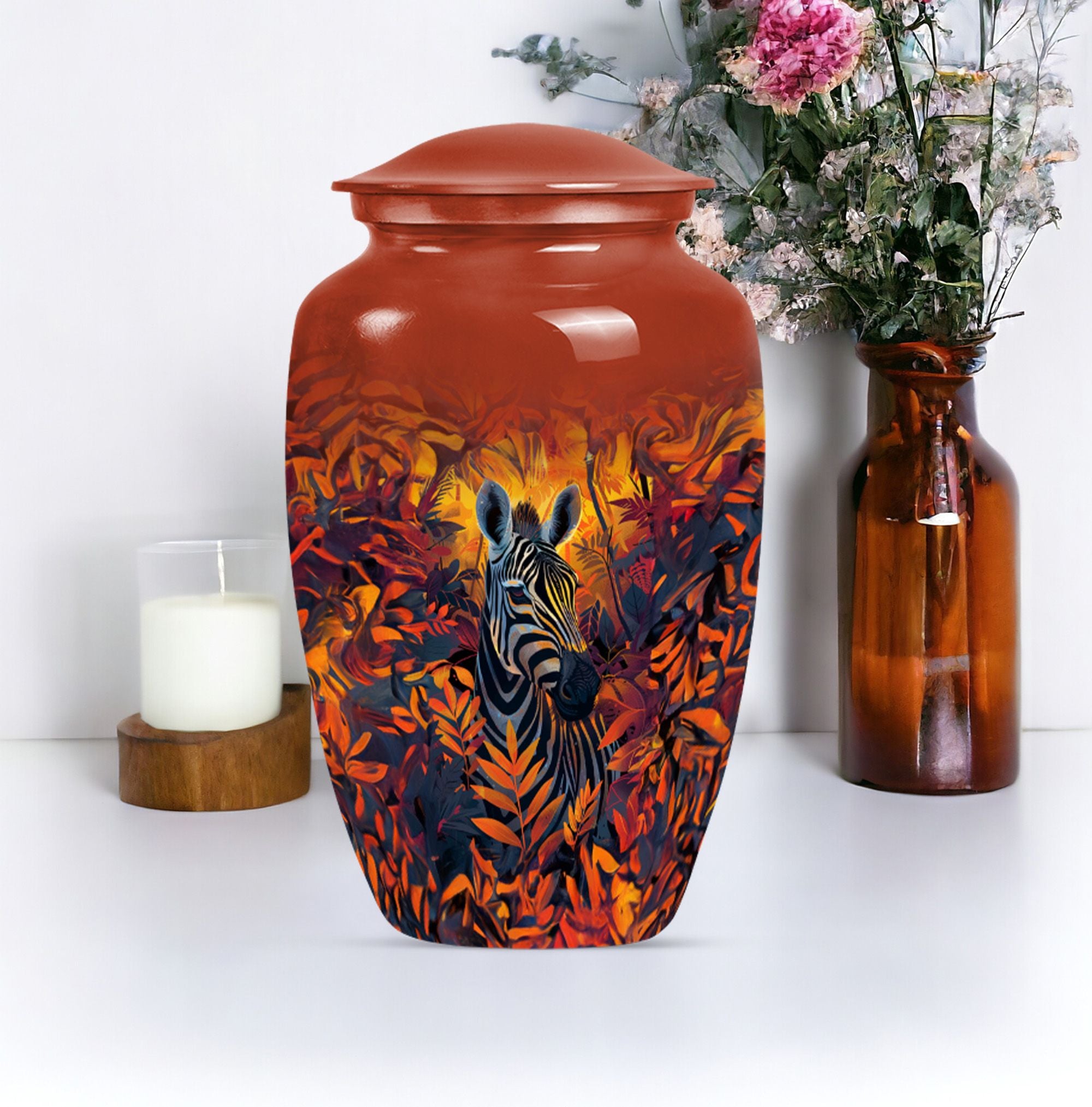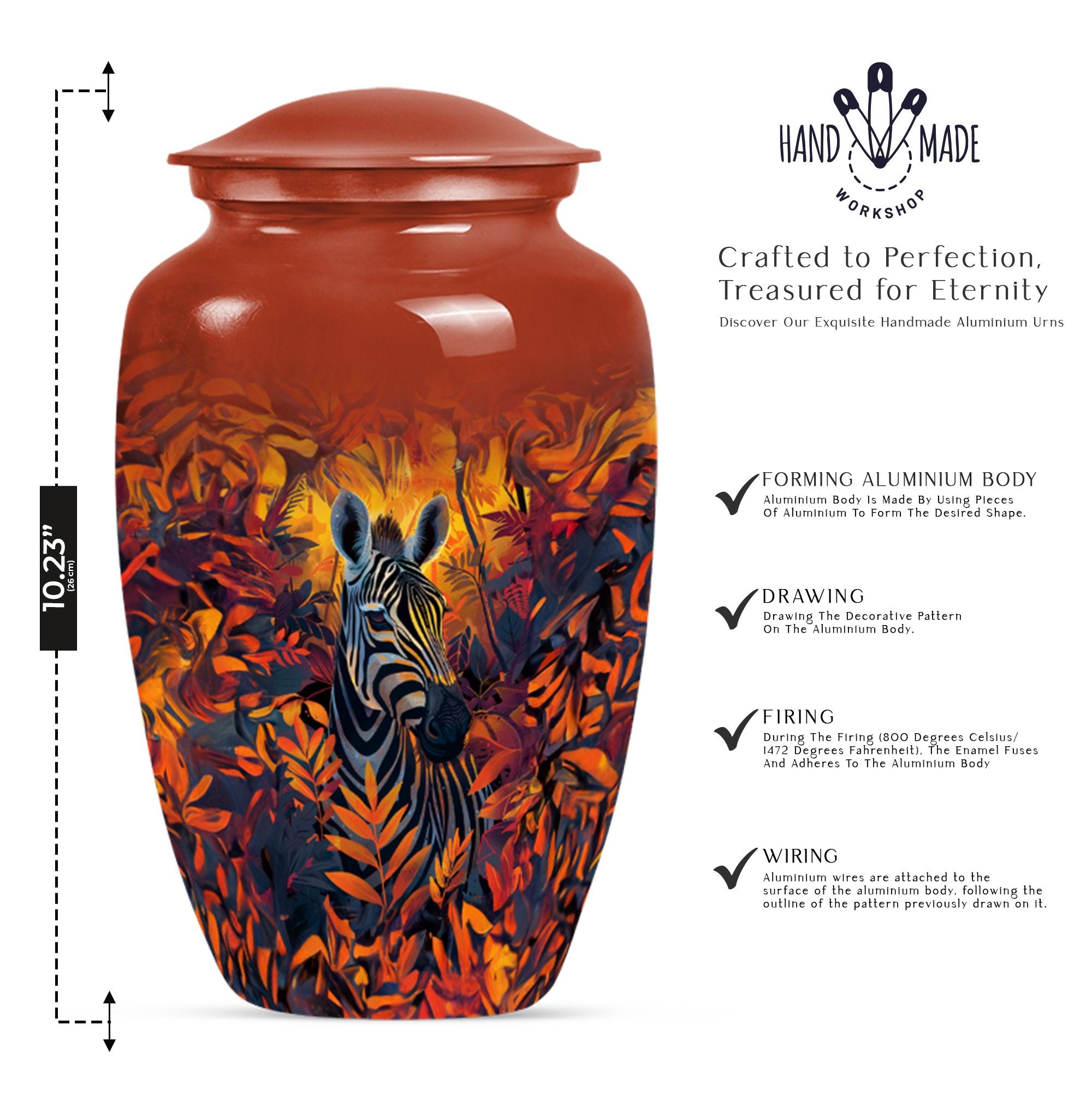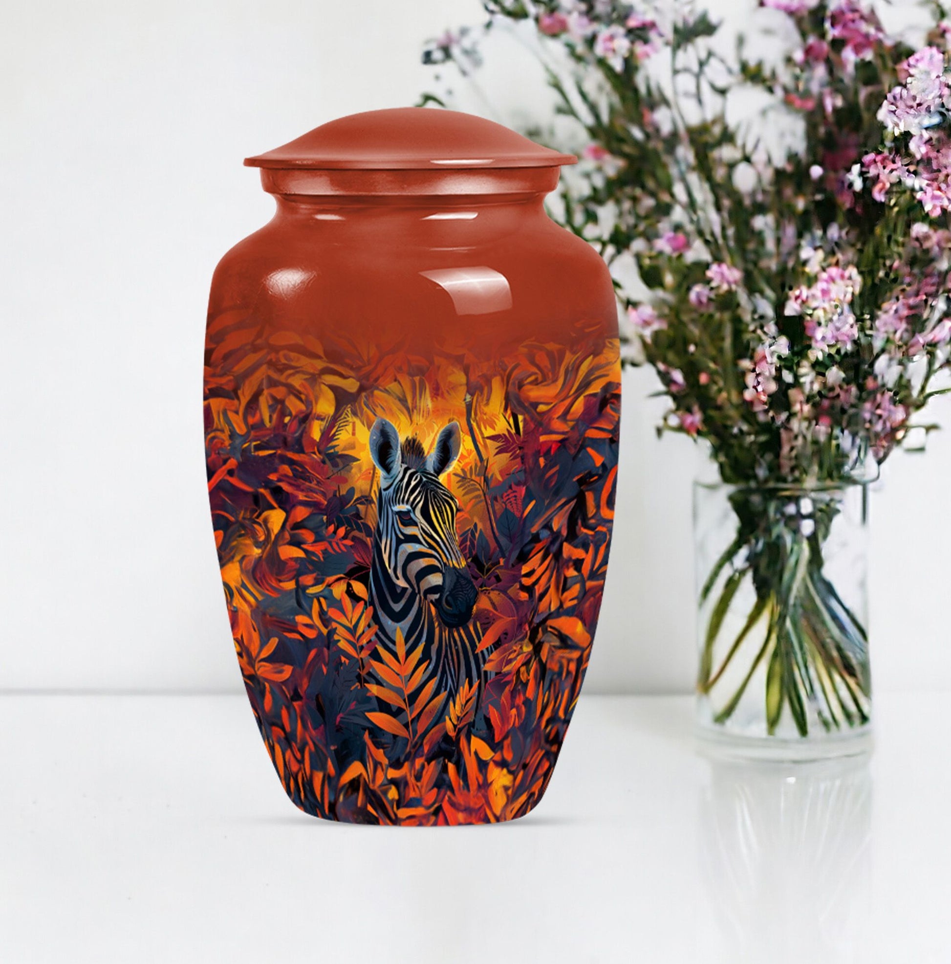 Embark on a journey of remembrance with our brilliant zebra urn. This large, classic urn is perfect for storing 200 cubic inches of loved one's ashes securely. The urn towers at an impressive height of 10-inch, casting a serene sense of presence in any setting. Each product comes with a plush velvet pouch, providing a delicate and respectful containment for the cherished remains. We understand the need for individuality during this sensitive time, which is why we are offering a unique personalization feature- impart your touch to this memorial with engraved names. Crafted with high quality aluminium, the urn not only stands the test of time but also adds a touch of elegance to its surroundings. The abstract theme of the design serves to ignite remembrance and peace, going beyond functionality. Our product seamlessly balances weight and size, weighing a mere 3.3 pounds, making it easy to handle. When it comes to memorial urns for adult ashes, our zebra urn leads the way in standout appeal and heartfelt tribute, making it much more than just an urn.