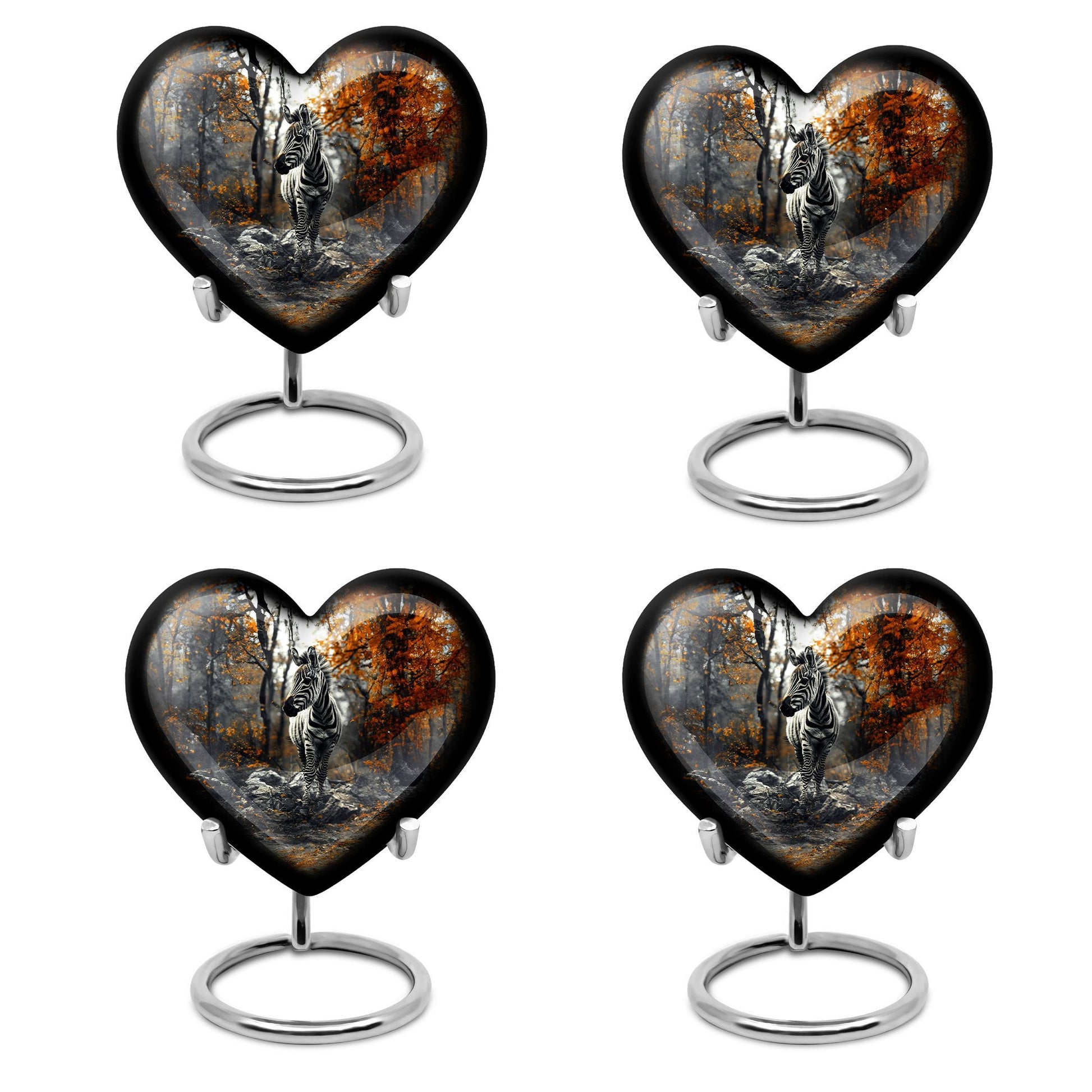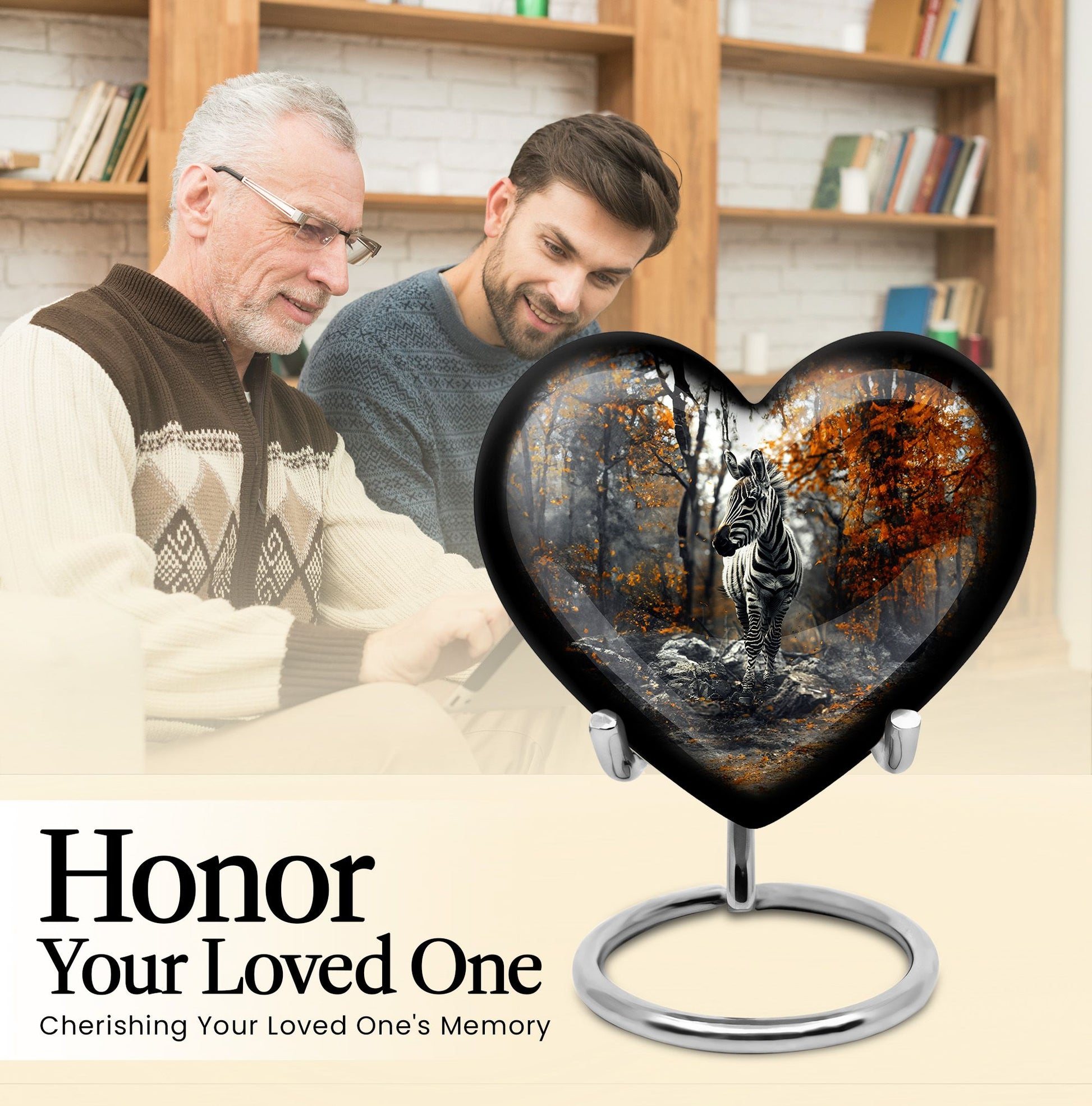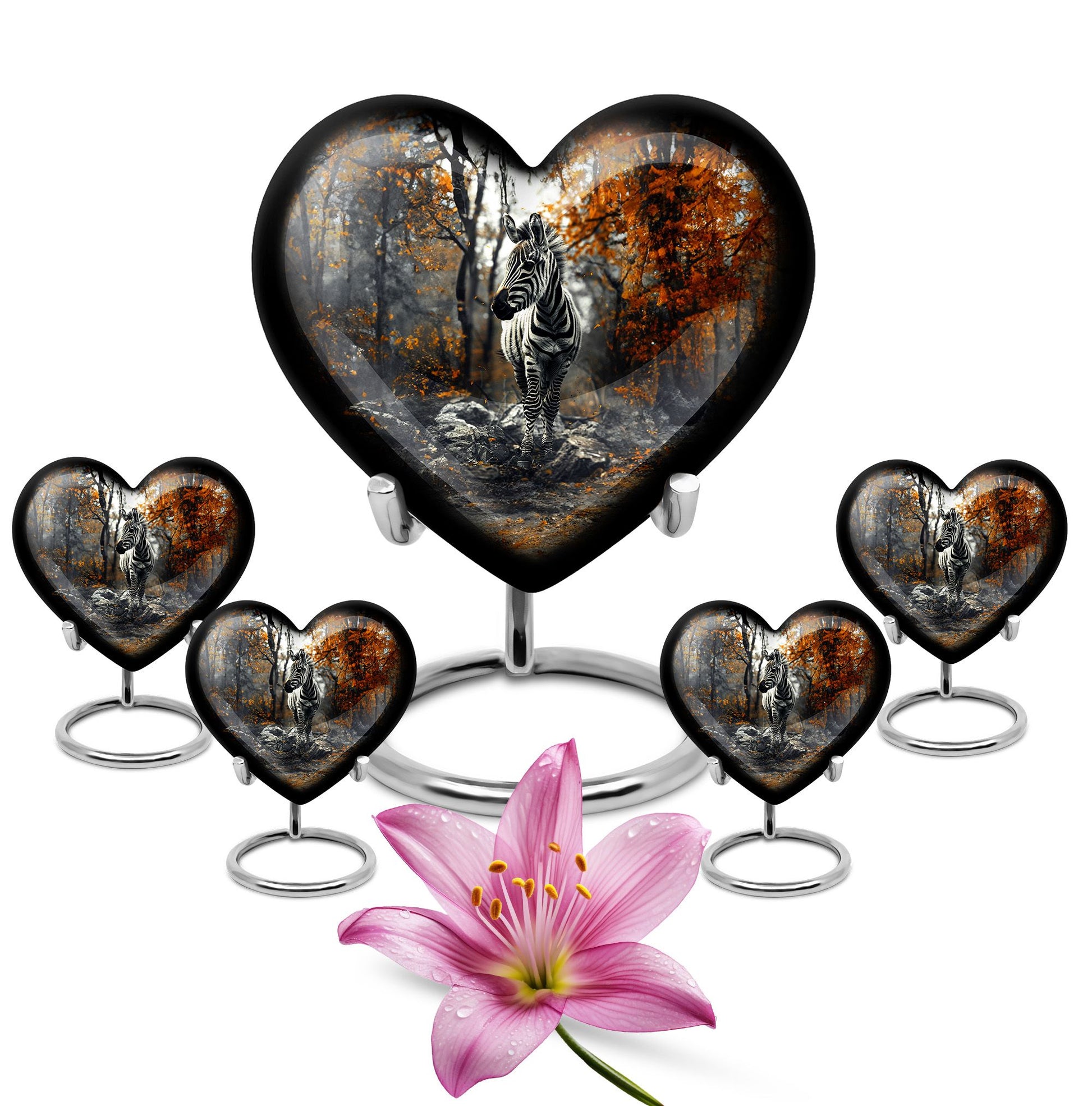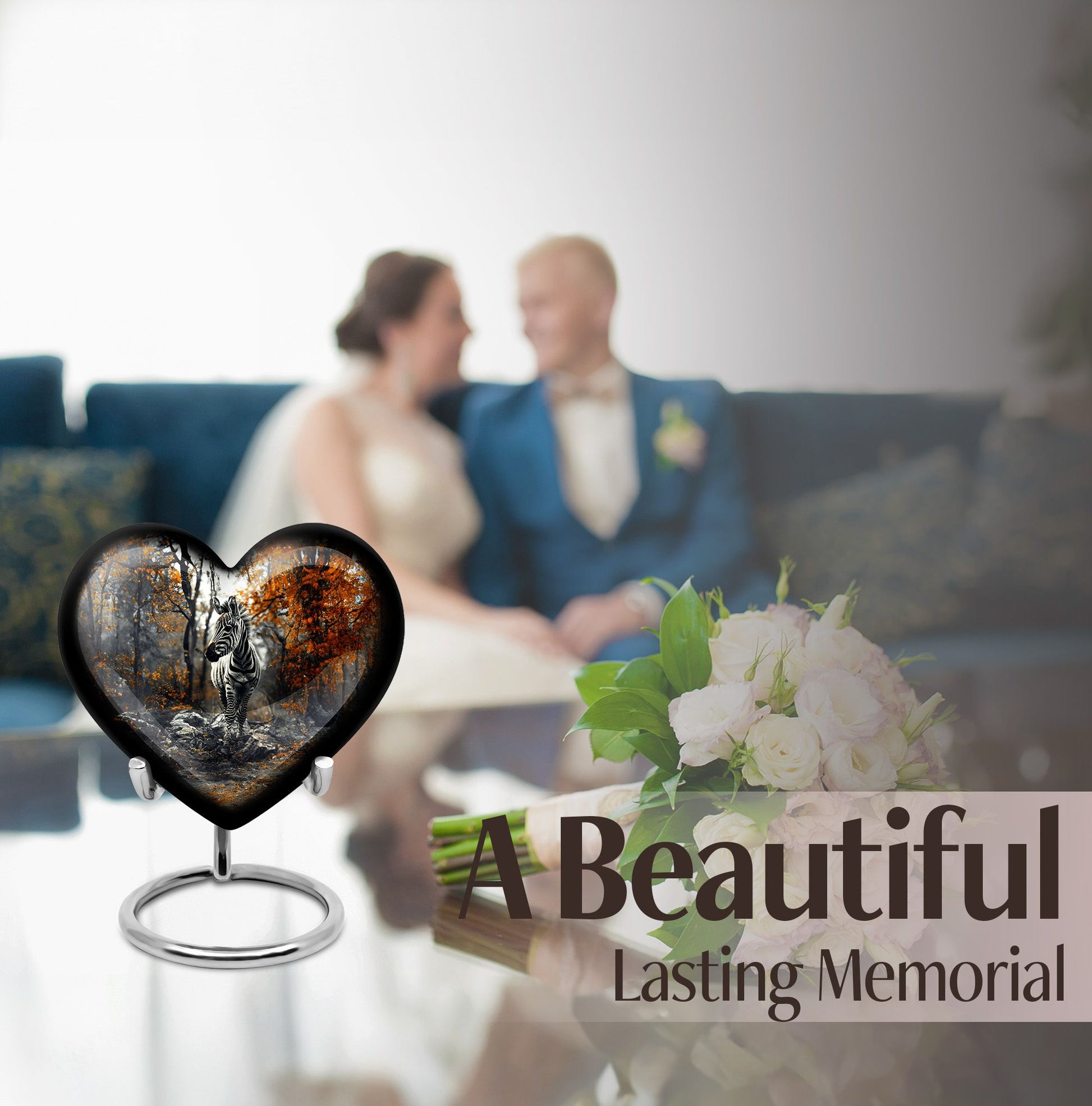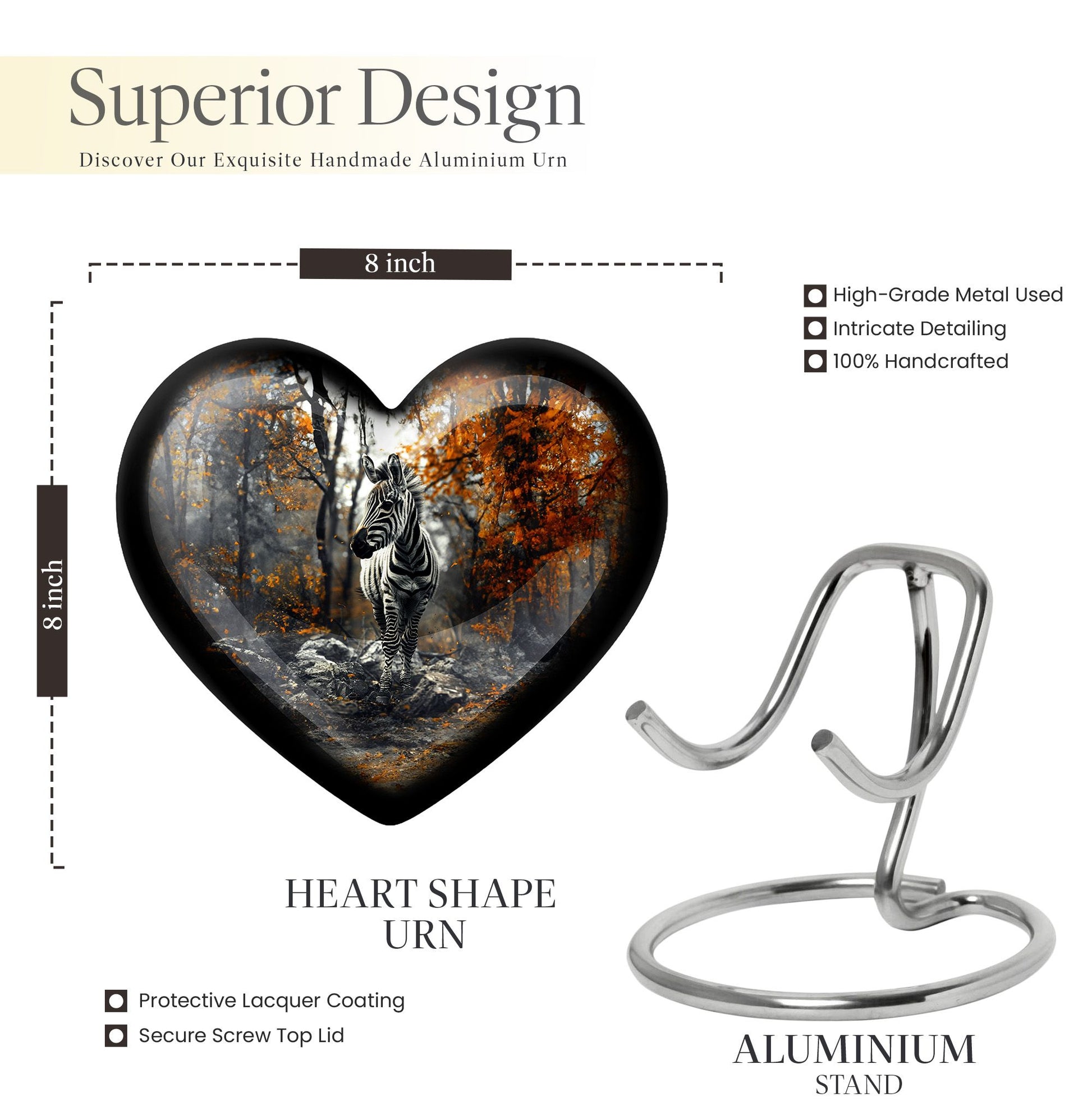 Express your tribute in a truly sublime manner with this onotable 10 Inch 'Heart Urn' for a cremation ceremony. Specifically tailored for adults and seniors, this cremation urn, cast in long-lasting Aluminium is a prime epitome of elegance. With the capacity to accommodate up to 200 cubic inches, this urn exhibits an abstract theme that is bypasser of the standard designs, offering a large urn that stands 10 inches in height and weighs just about 3.3 pounds, making it manageable and transportable. This zebra urn stands alone in the market, an absolute jewel in cremation urns for men. A bonus addition is the velvet pouch provided for secure containment of ashes. For a more personal feel, there's an option of engraving names or a heartfelt message. This urn provides a touching memorial for your loved one and a beautiful focus for your memorial service. A strikingly artistic and meaningful storage like the 'Heart Urn' is a prime choice for those on a quest for burial urns for cremation ashes. Disclaimer: Product does not include 'Urn Design'.