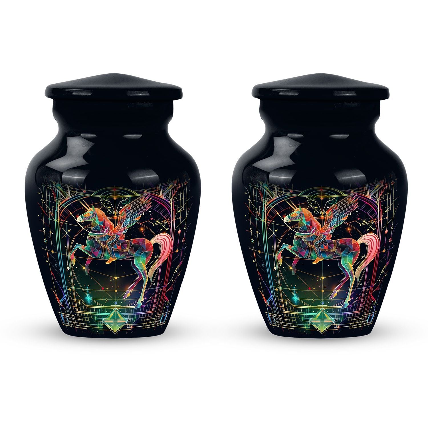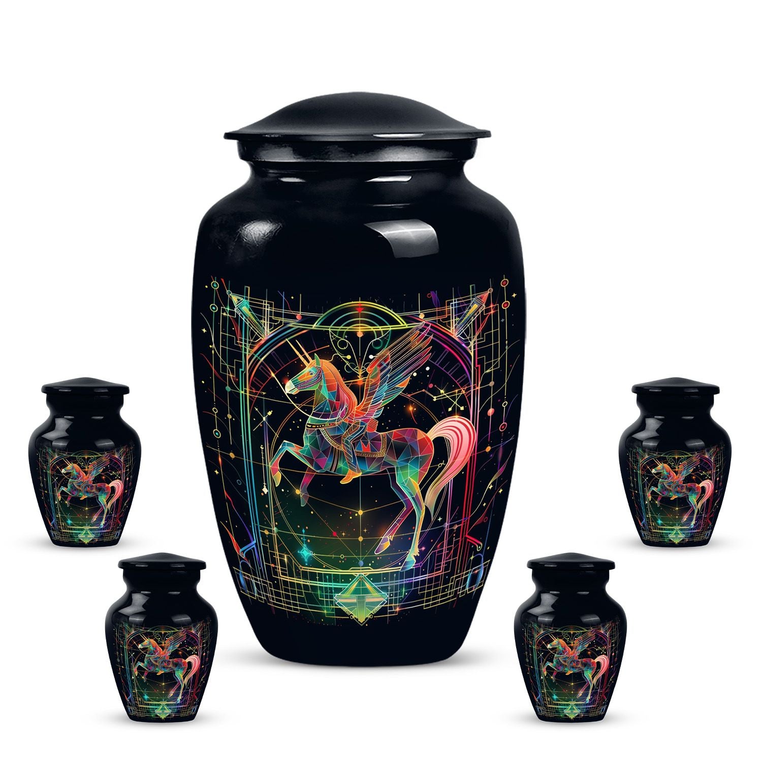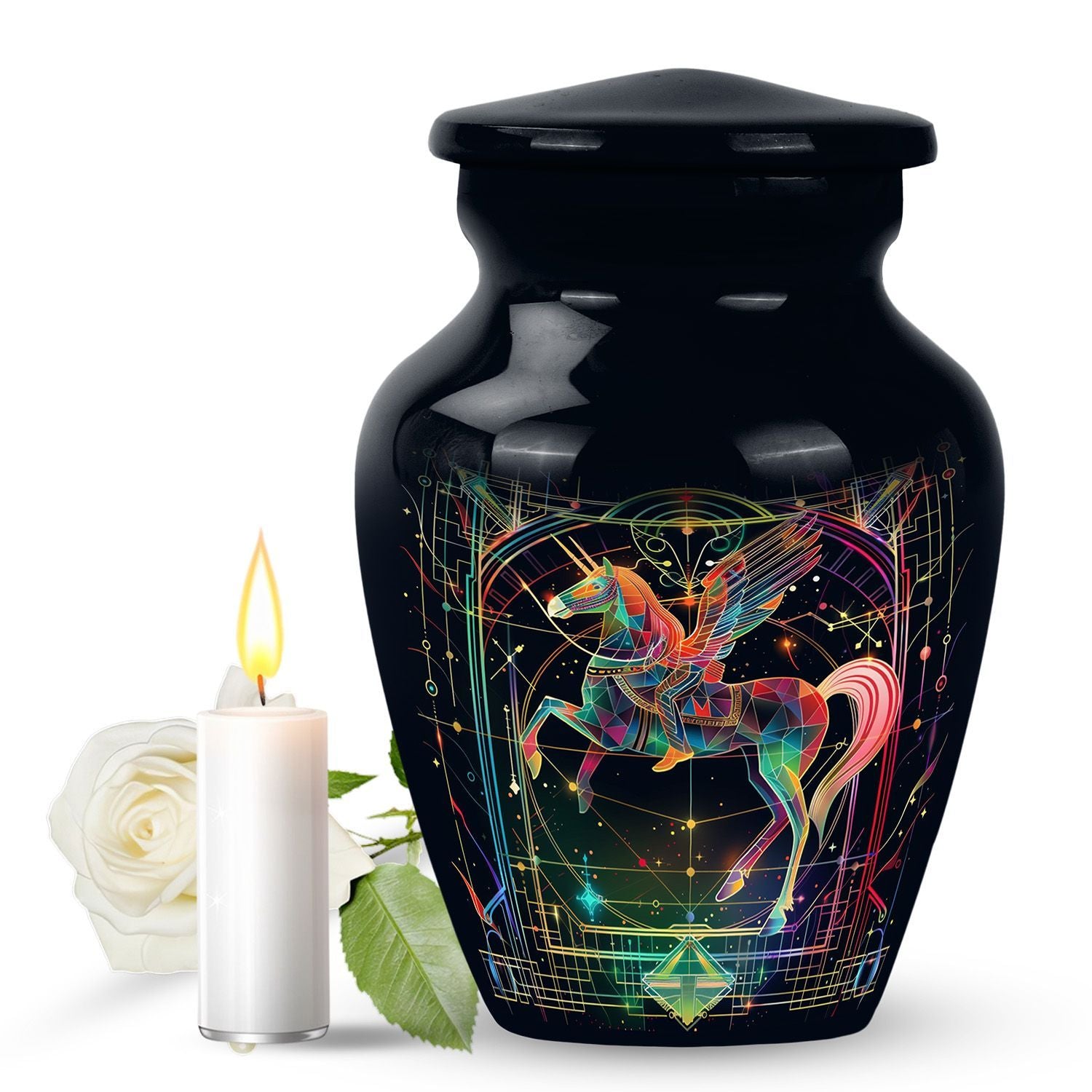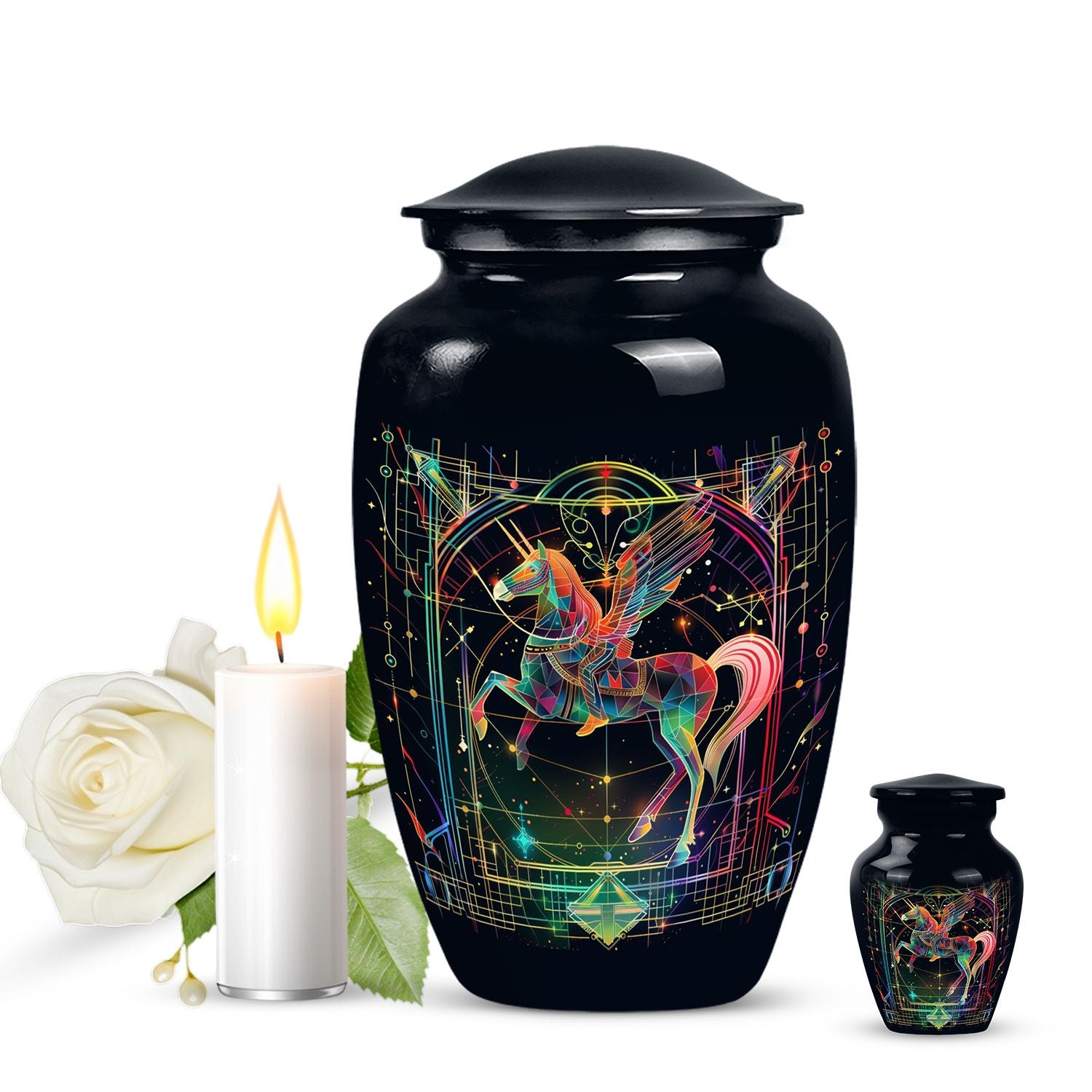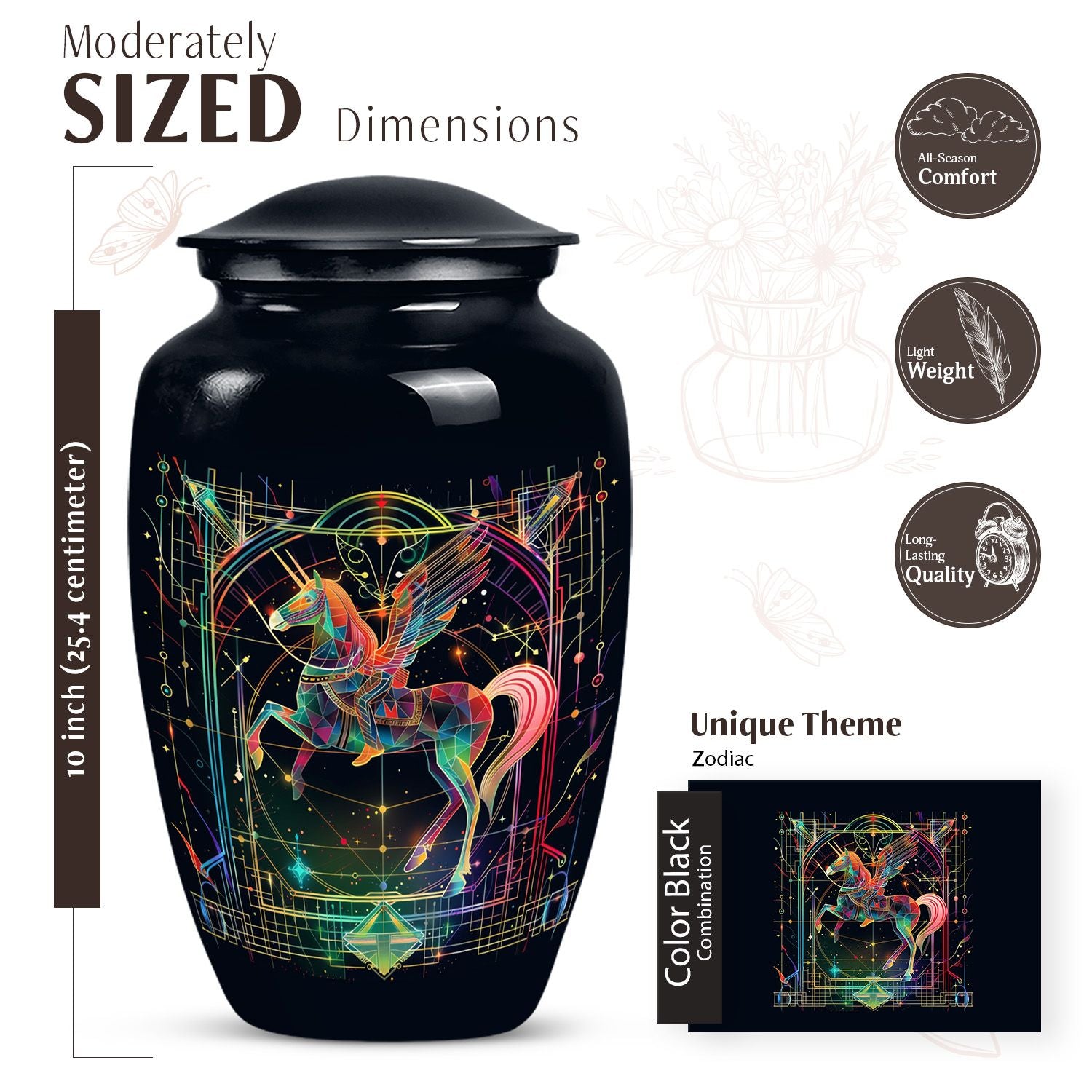 Honor your dearly departed with our unique Zodiac Urn, specifically designed as a final resting place for adult human ashes. Our large, cremation urn is carefully crafted from durable aluminium, ensuring a lasting tribute to your loved one. Each urn measures a significant 10 inches in height and weighs 3.3 pounds, reflecting its sturdy build. It offers an impressive capacity of 200 cubic inches, ample room to safely contain your loved one's remains. With the thoughtful addition of a velvet pouch, the containment of ashes is made subtle and graceful. This abstract themed urn stands out because of its personal touch. Not just an urn, it serves as a keepsake that can be personalized with engraved names. This classic urn is a beautiful way to remember and honor your loved one. Typically used for funeral burial, this urn is also ideal for placement on a shaped shelf in your home as a remembrance. The unique zodiac theme makes this piece a treasured keepsake that transcends the usual funeral burial urns for adult human ashes.