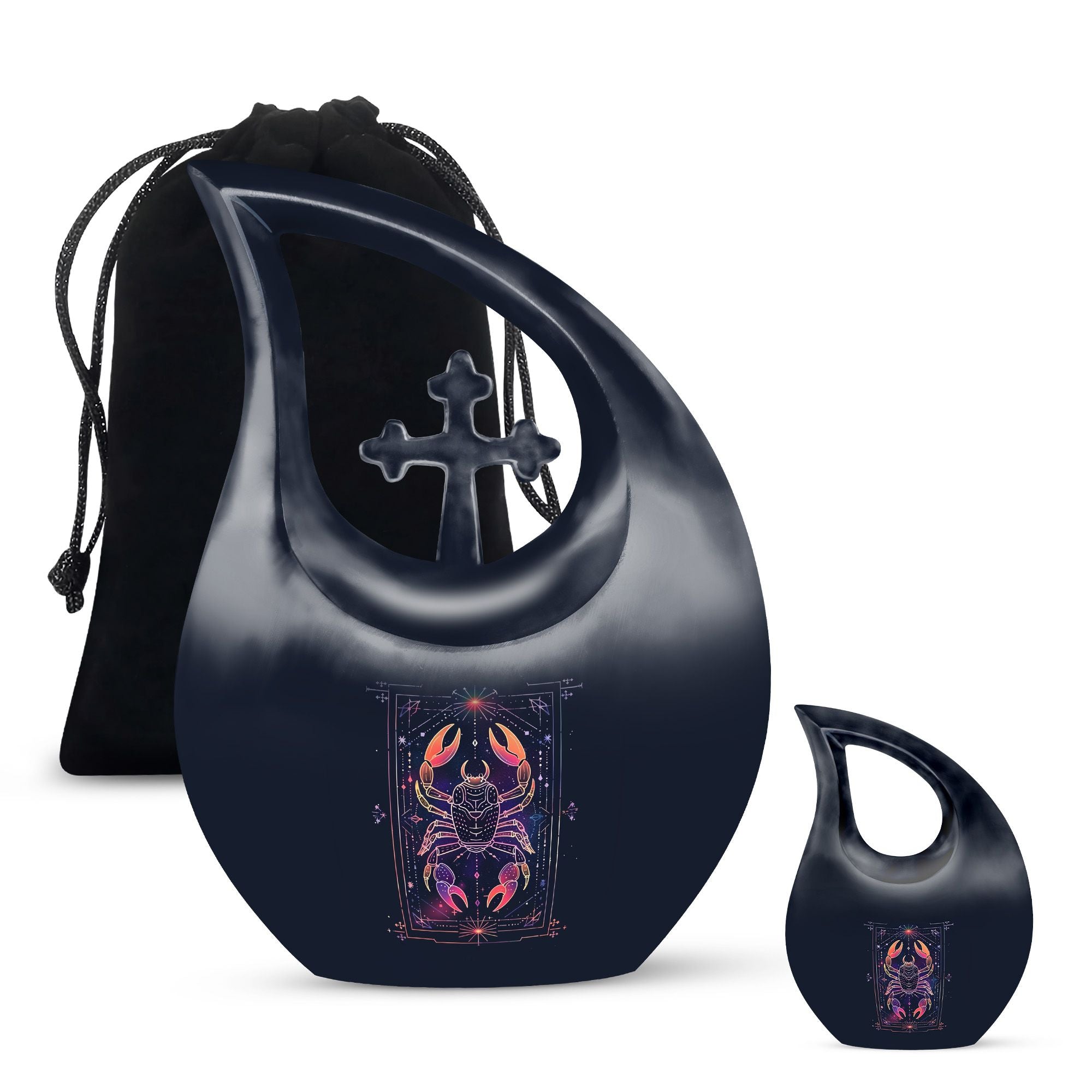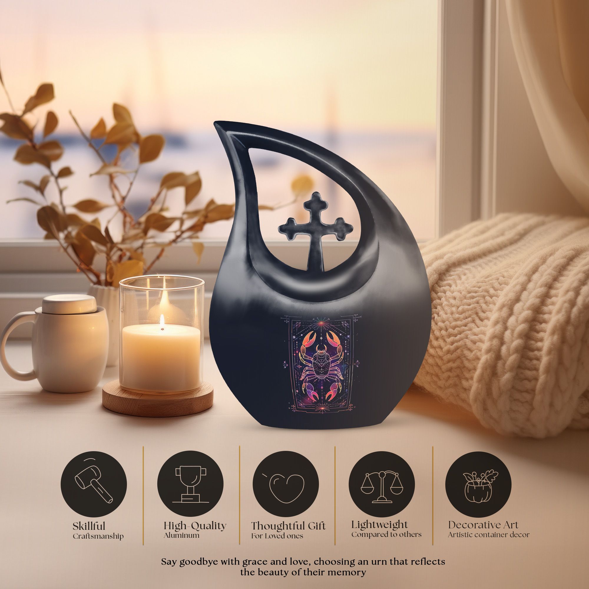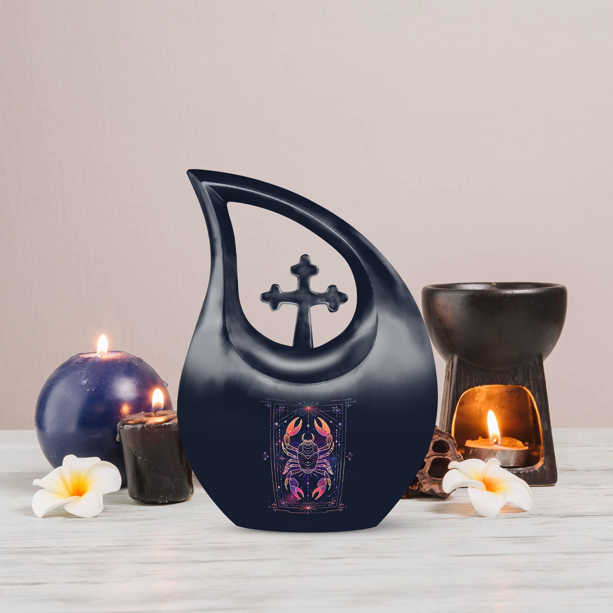 Showcase your tranquil tribute to your loved ones with our Zodiac Cross Drop Large Urn. This 10-inch memorial urn, showcasing an alluring zodiac theme, is suitable for adults and seniors seeking unique, spiritual ceremony supplies. Crafted meticulously from high-quality aluminium, the urn encompasses a volumetric capacity of 200 cubic inches. Despite its large size, the urn has a comfortable weight of only 3.3 pounds. The prominence of the urn is further amplified with a Cross Drop design, imbuing an aura of spiritual reverence and remembrance. Additionally, the urn offers a personal touch, providing an option to engrave names. Each urn comes with a velvet pouch, safeguarding the containment of ashes. Radiating an eternal celestial charm, our urn is just not an artefact, but a vessel of cherished reminiscences. Suitable as garden urns for ashes, this can be a commemorative choice for lasting memories. Well-suited for terms like 'Zodiac Urn', 'Personalized Urns For Ashes', 'Cremation Urns', and 'Burial Urns' when sought.