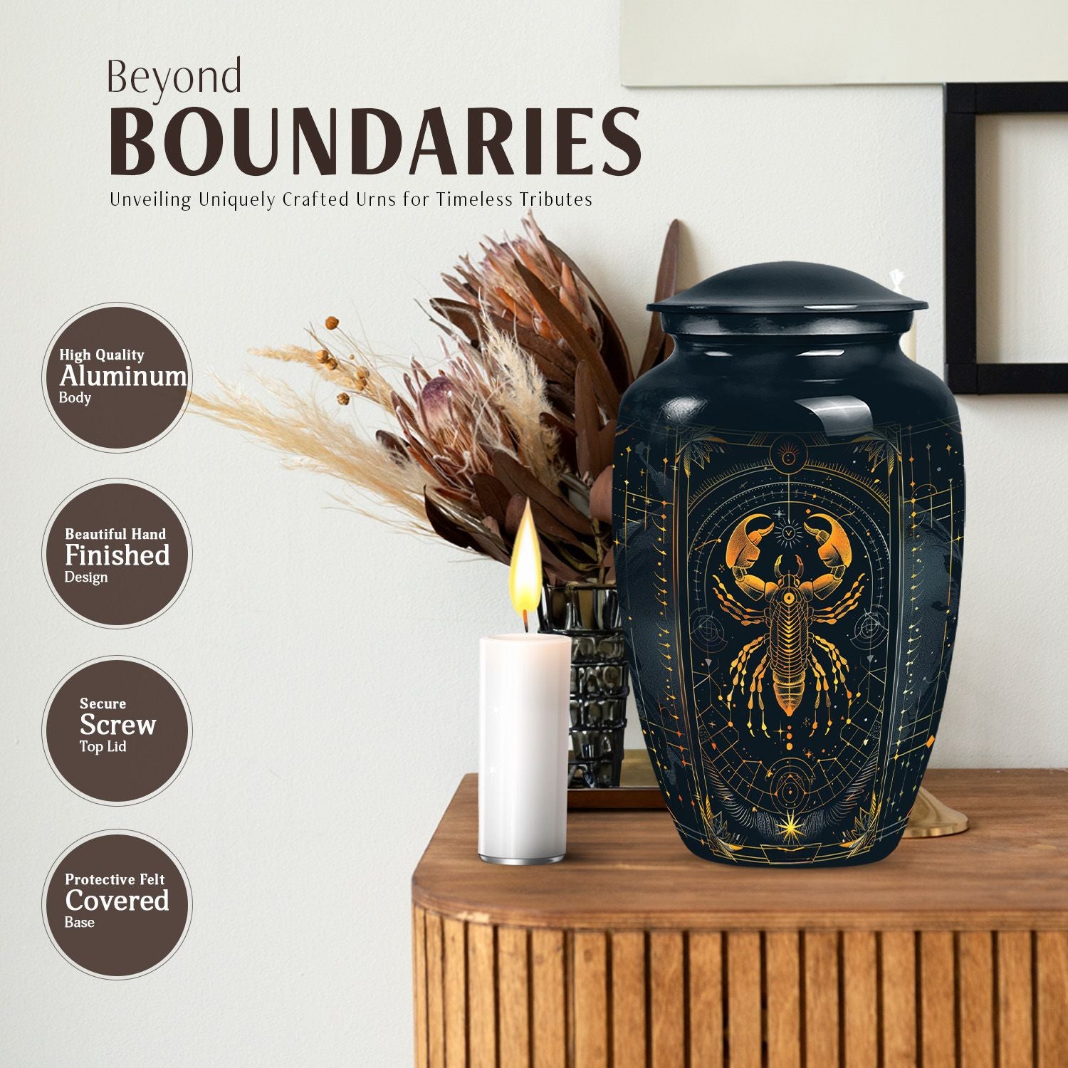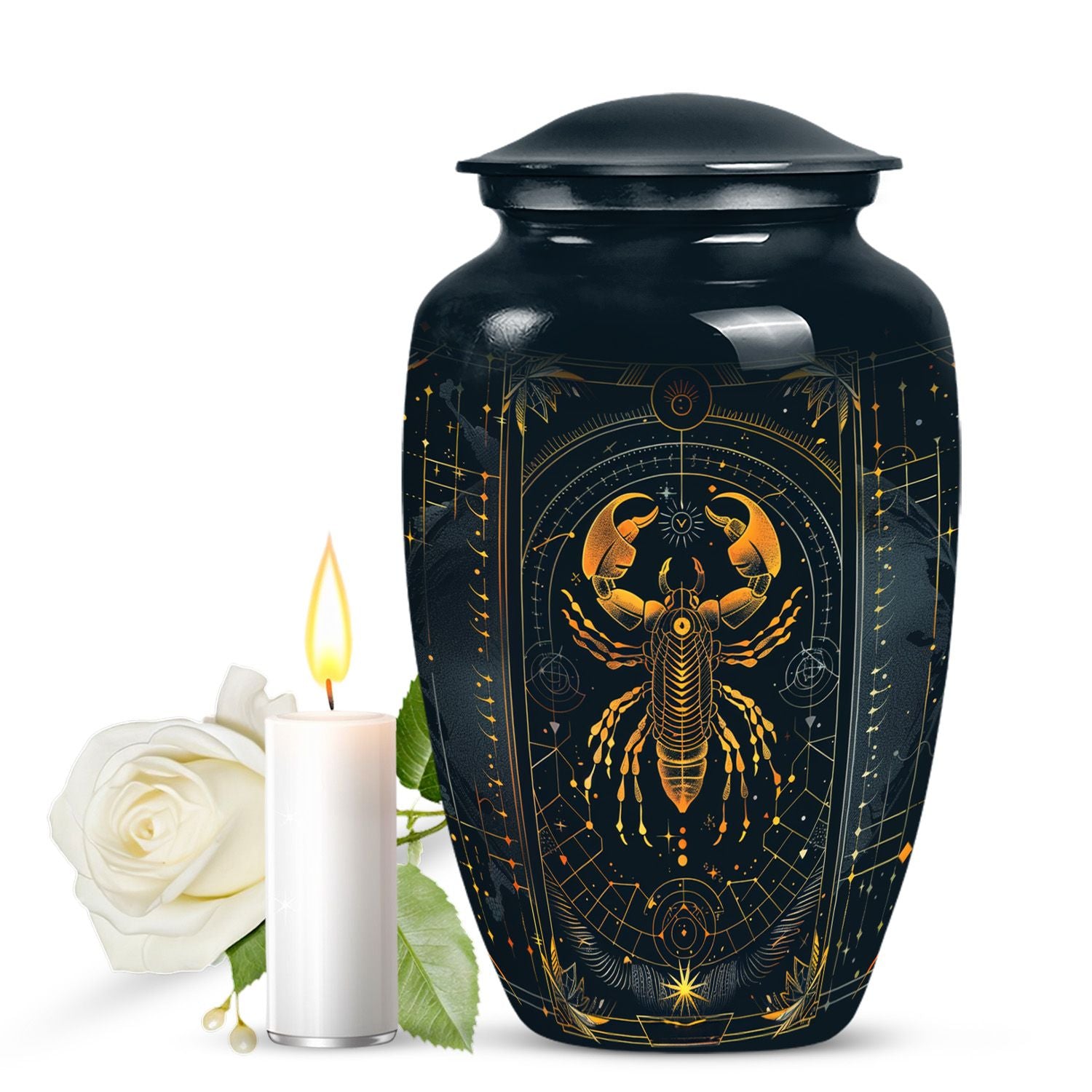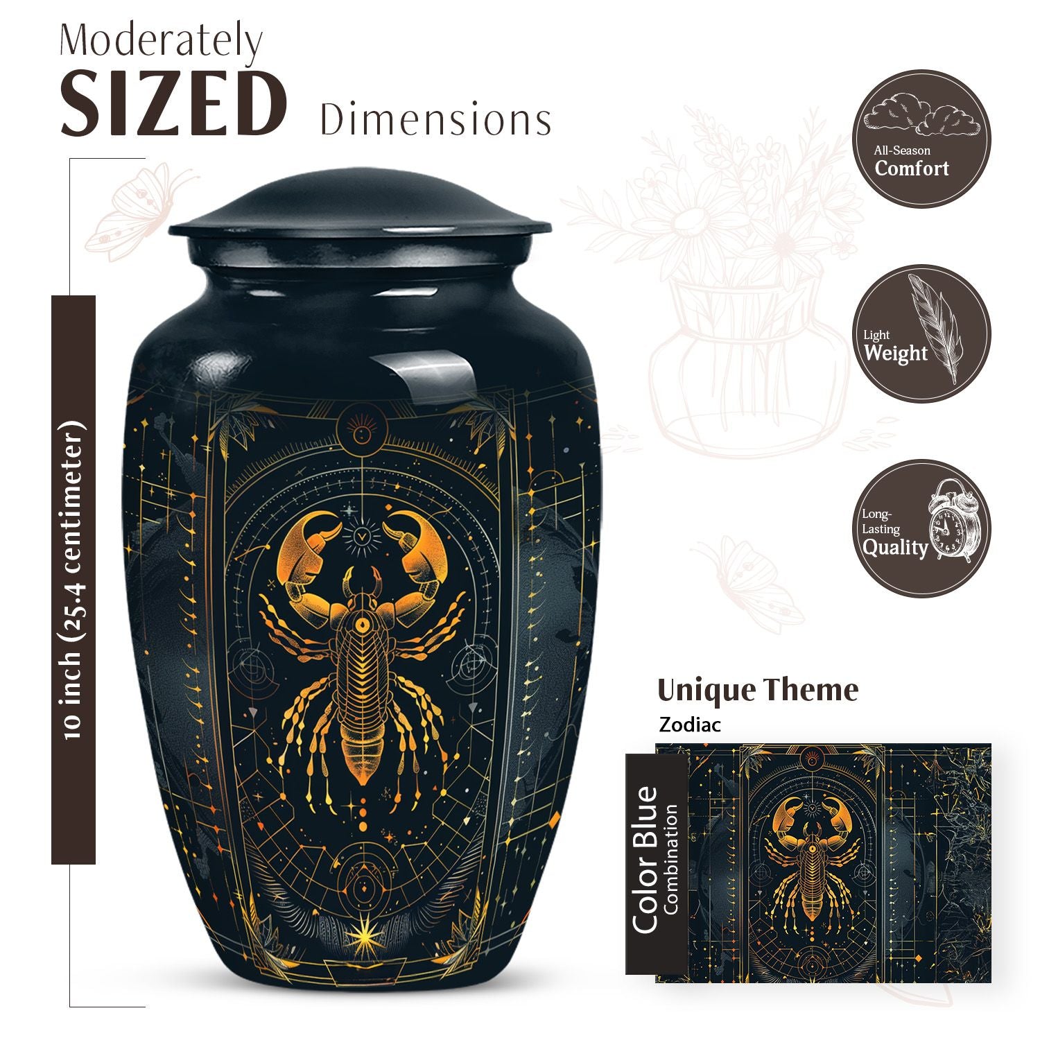 With a size of 10-inch, this Large Urn is an elegantly crafted zodiac urn perfect for memorializing your loved ones. Constructed from strong and enduring Aluminium, it weighs around 3.3 pounds and exhibits dimensions of 10 inches in height. This funeral cremation urn for women is not just a beautiful piece of art, but it's also versatile with a capacity of 200 cubic inches, ideal for containing the ashes of your beloved. The product also includes a soft velvet pouch for the safe containment of ashes. This urn can be personalized, enabling you to engrave names or special messages to make it truly special and unique. The abstract theme bestows it with a distinct aesthetic appeal, making it a perfect accent for any setting or commemoration. It's not just an urn shaped container, but a comforting token of remembrance. Includes unique variations such as 'memorial large urns for ashes', 'ash urn' and 'funeral urns for adult ashes'. Experience the perfect amalgamation of love, remembrance and art with this funeral cremation urn.