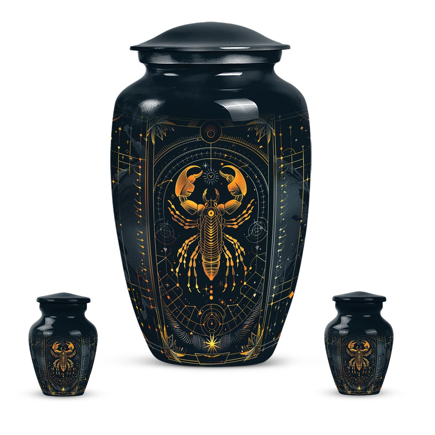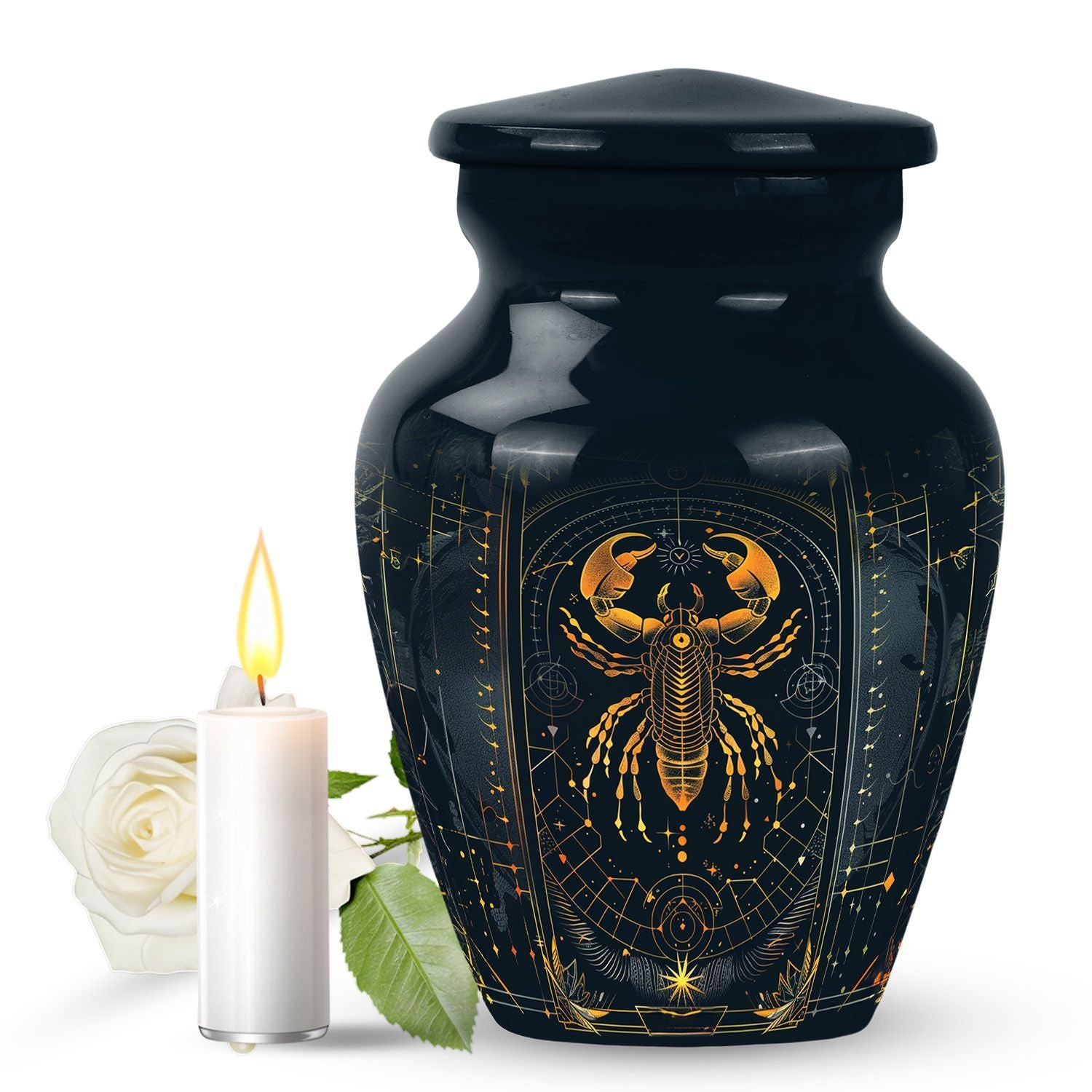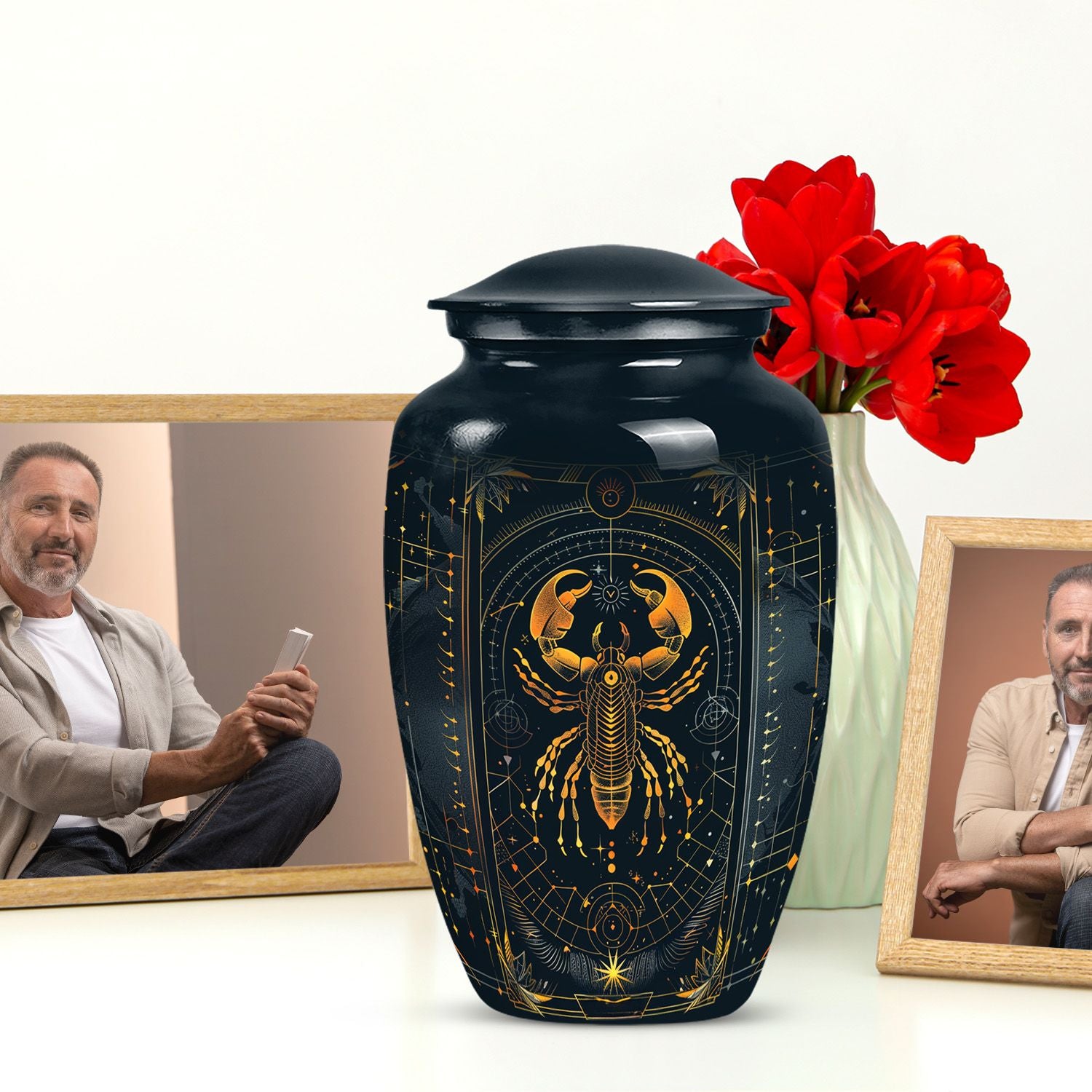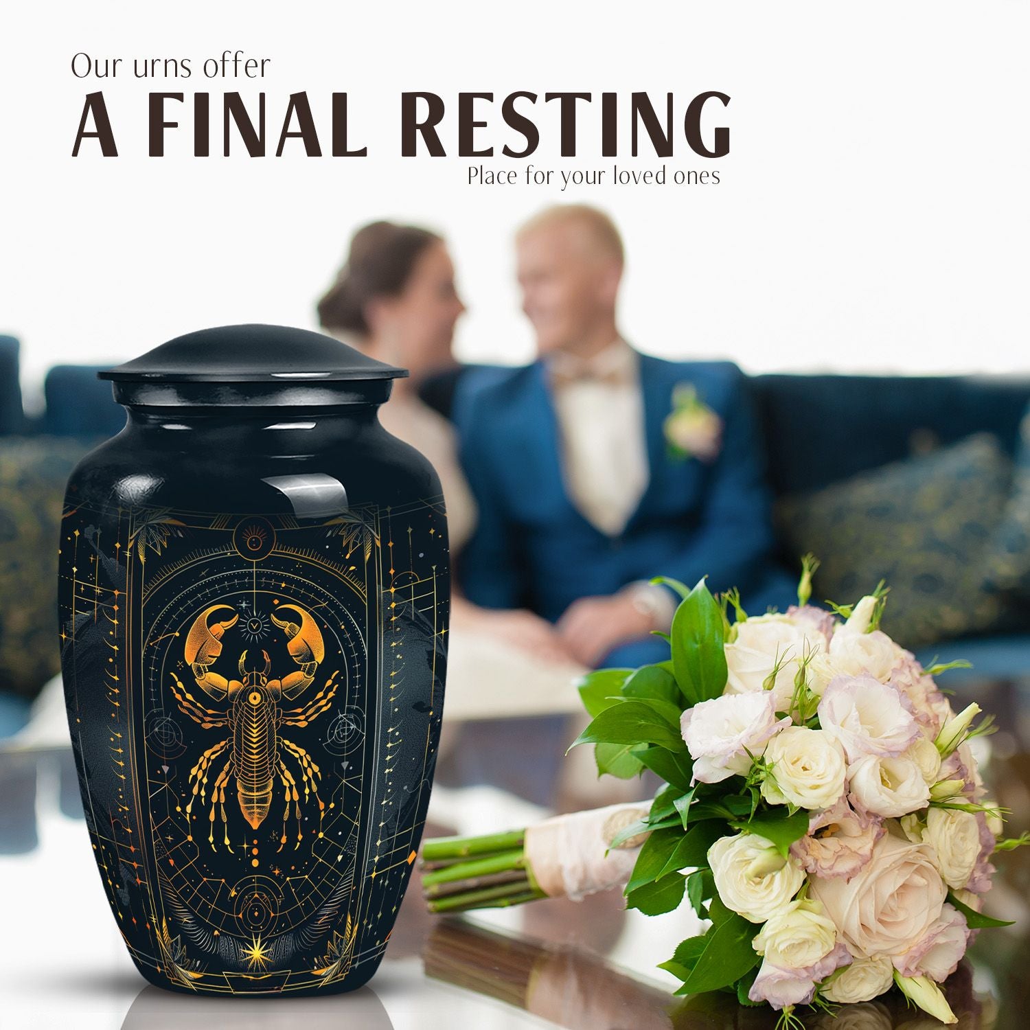 With a size of 10-inch, this Large Urn is an elegantly crafted zodiac urn perfect for memorializing your loved ones. Constructed from strong and enduring Aluminium, it weighs around 3.3 pounds and exhibits dimensions of 10 inches in height. This funeral cremation urn for women is not just a beautiful piece of art, but it's also versatile with a capacity of 200 cubic inches, ideal for containing the ashes of your beloved. The product also includes a soft velvet pouch for the safe containment of ashes. This urn can be personalized, enabling you to engrave names or special messages to make it truly special and unique. The abstract theme bestows it with a distinct aesthetic appeal, making it a perfect accent for any setting or commemoration. It's not just an urn shaped container, but a comforting token of remembrance. Includes unique variations such as 'memorial large urns for ashes', 'ash urn' and 'funeral urns for adult ashes'. Experience the perfect amalgamation of love, remembrance and art with this funeral cremation urn.
