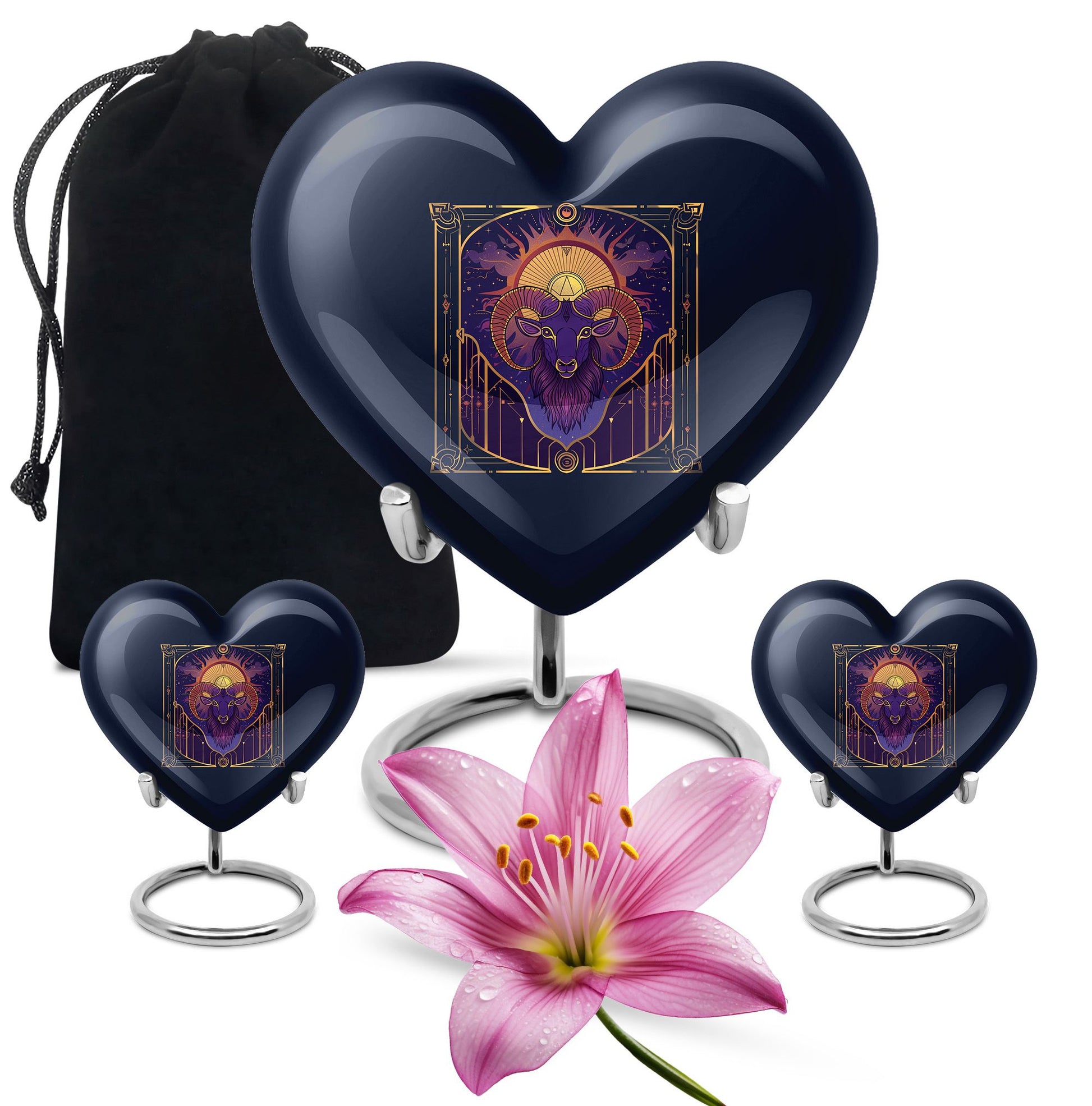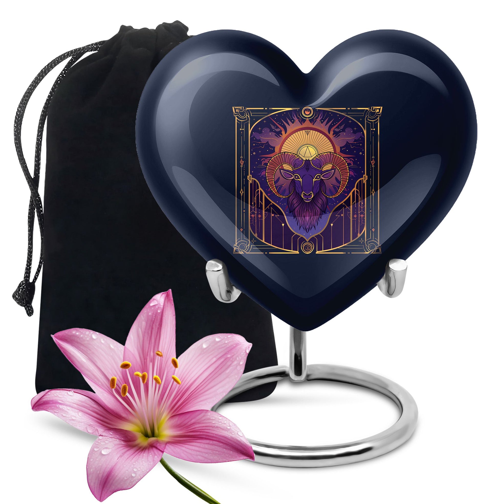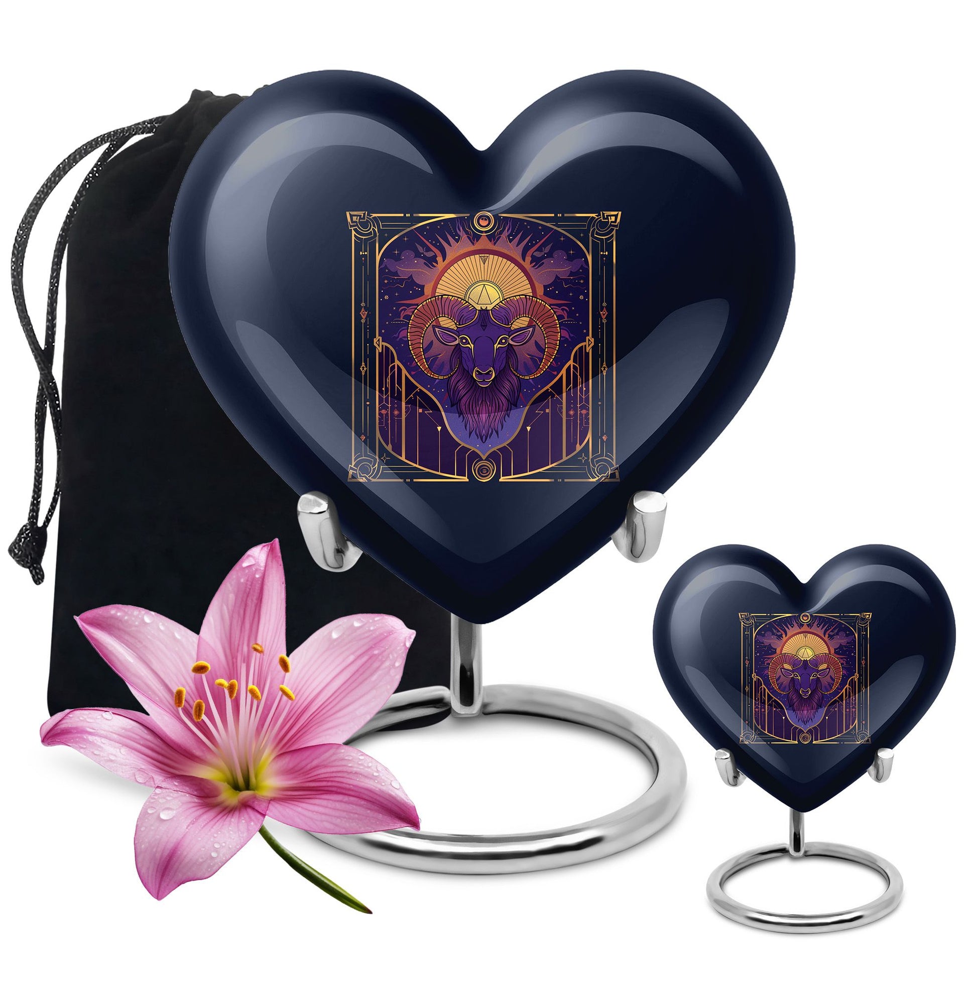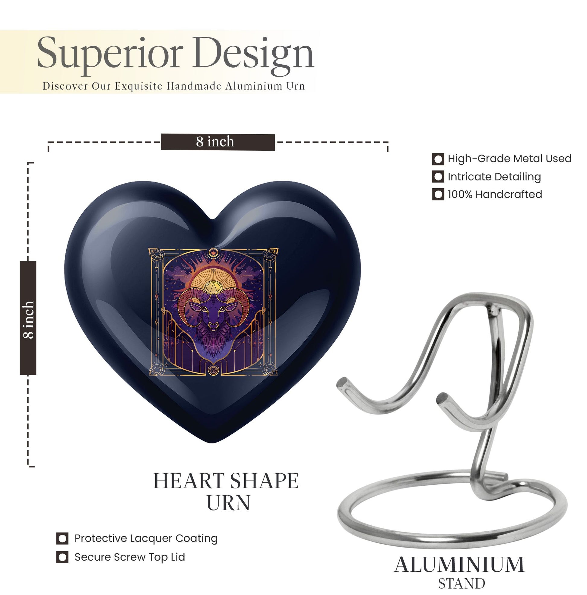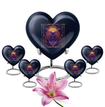 Honor the memories of your loved ones in an intimate and dignified manner with this Zodiac Memorial Large Urn for ashes. Crafted meticulously from high-quality aluminium, this 10-inch large urn weighs 3.3 pounds and holds up to 200 cubic inches of ashes, making it an apt resting place for your dearly departed. The urn's abstract theme offers a serene and thoughtful touch, resonating with tranquility and grace. Each order comes complete with a soft velvet pouch for secure containment of the ashes, enhancing the sanctity of this memorial ceremony supply. For a personal touch, you can customize it by engraving names upon it. This cremation urn is an ideal choice for artistic souls seeking for a profound symbol of love and remembrance. A perfect amalgamation of elegance and peace, this handcrafted funeral urn for women's ashes resonates with solitude and remembrance.