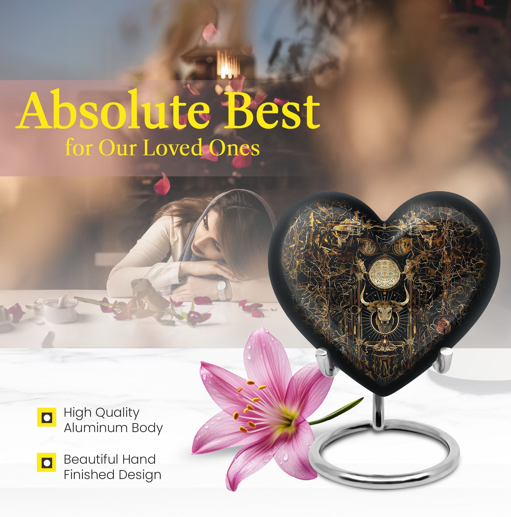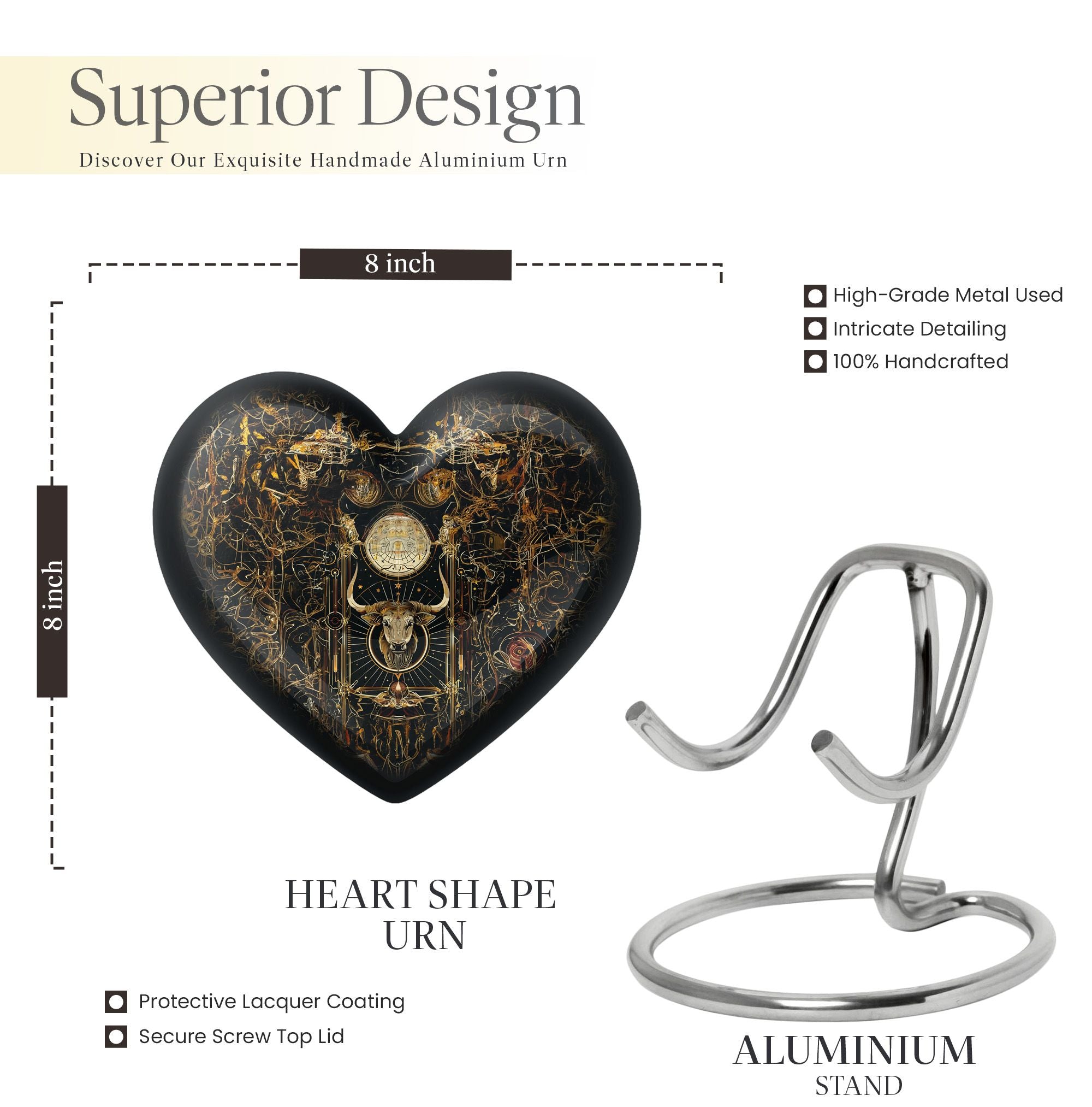 Keeping your loved ones' memories alive has never been more personal. Introducing our Large Zodiac Urn, an exclusive piece made from sturdy Aluminium with a heart-warming Zodiac theme heart design. With a sizable dimension of 10 inches height and weighing just 3.3 pounds, this urn is designed to securely hold up to 200 cubic inches of ashes. It seamlessly blends functionality with sentimentality. The urn's size ensures that it never feels overly obtrusive, making it an ideal choice to commemorate your dearly departed. Take personalization a step further with our customization option and engrave names directly onto the urn. For your convenience, it comes packaged with a velvet pouch for containment of ashes. This product isn't merely an urn; it's a keepsake, a symbol of enduring love. Perfectly suitable for funerals, it also serves as an intimate piece for those moments when you miss them the most. Explore our extensive collection of one-of-a-kind funeral urns and cremation urn burial options, where every urn tells a story.